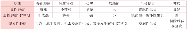 良性肿瘤与恶性肿瘤的根本区别是细胞分化程度【2014】。交界性肿瘤在生物学行为上介于良性与恶性之间的临界性肿瘤。