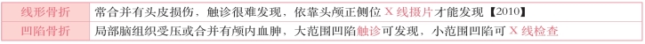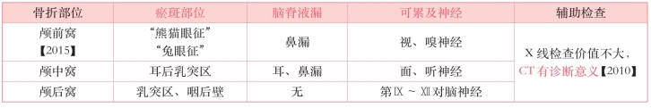 2.颅底骨折 颅底骨折一般为线性骨折,不出现移位,也不出现 骨折畸形的特征【2015】。多为强烈间接暴力引起,常伴有硬脑膜破裂,引起脑脊液外漏或颅内积气。颅底骨折的临床表现及辅助检查见下表。