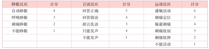 1. 意识状态格拉斯哥昏迷计分法(GCS),分别对病人的睁眼、言语、运动三方面的反应进行评分,累计得分,最高为15分,总分低于8分表述昏迷状态,分数越低表明意识障碍越严重(见表)。