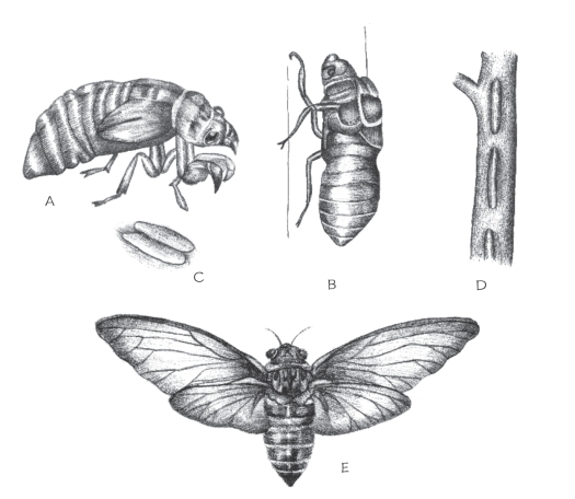 A.拟蛹;B.蝉蜕;C.卵;D.产卵的树枝;E.成虫。