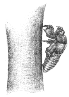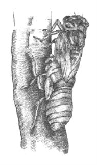 在地下脱皮的回数,从来多说二十五回到三十回,现在知道的确只经过四回变成拟蛹就叫作腹育。拟蛹全体淡褐色,长着翅鞘,从地中爬出,攀登草木。经过最后一回的脱皮,便变成蝉。于是长长的黑暗生活完结,又重睹光明了。它脱下的皮,往往一径挂在树干上,这叫作蝉蜕。