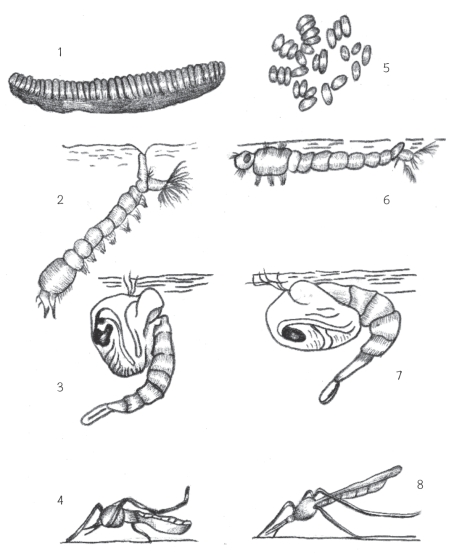 蚊的生活史:1-4,常蚊;5-8,疟蚊。
