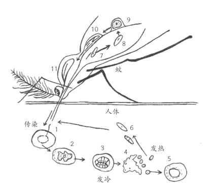 1.种虫侵入血球;2,3.种虫发育为疟虫;4.疟虫破坏血球散出疟胞子;5.疟胞子侵入别个血球;6.长形胞子;7,8.长形胞子进入蚊体内接合成接合体;9,10.接合体进入胃壁内逐渐发育产生种虫;11.种虫进入唾液腺里,待机进入人体。