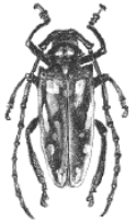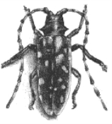 星天牛(Melanauster chinensis Farster)体长二十四至三十三毫米,是大形种。体现有光泽的黑色;但下面及脚上,有稍带蓝色的灰白毛密生着。触角比身子更长,各节的基部现带蓝的灰白色。前胸背的中央部,有一个瘤状突起;两侧还有粗大的棘状突起。大形鞘翅的基部,有许多大点刻,翅面不规则地散布着十五六个白点。幼虫蠹入桑、无花果、橘、柳等材部,是一种遍布我国南北的有名害虫。