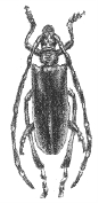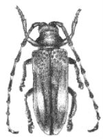 锯天牛(Prionus insularis Motschulsky)体长二十四至四十毫米。体色,除体的下面和触角现黄褐色外,全是有光泽的黑褐色。头向前方突出,眼睛很大,触角长,呈两锯齿状,最后三节最长。前胸的两侧,有锯齿状的突起。鞘翅粗糙,有大的纵沟和皱痕。脚颇粗,也现黄褐色。幼虫吃榆等枯木。人去碰它时,就摩擦胸部,发出尖锐的“叽叽”声。这是北方常见的普通种。