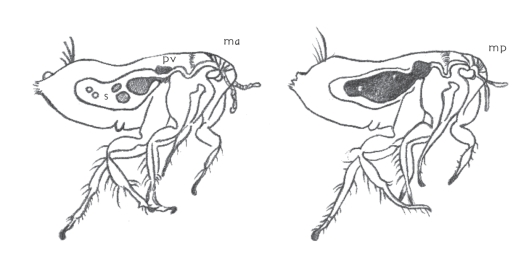 难道蚤吸血的时候,消化管里的液体不会倒流注入人体中吗?难道在消化管内繁殖的病菌,不会跟了这些液体,一同侵入吗?研究者们怀疑了,于是再埋头试验。一九一四年英国的培各脱(Bacot)和马尔汀(Martin)氏,对这问题给予正确的解答。就是:百斯笃菌在蚤的消化管内繁殖异常迅速,结成凉粉似的块状,几乎将整个胃塞住。于是这蚤益发感到渴燥,拼命地向人和鼠螫刺。可是胃被塞定,吸入的血液不能进去,反而倒流,从螫口注入人体内,这些逆流的血液,曾和往前胃的百斯笃菌的凝块相接触过,所以有多数百斯笃菌混在里面。不用说病就因此传染了。