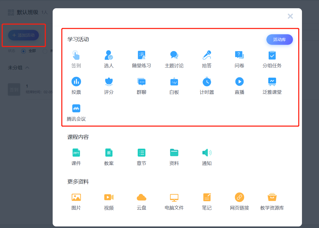 签到 | 课堂实时签到、学生线上考勤功能 | 五种签到方式:普通签到(拍照)、手势签到、位置签到、二维码签到、签到码签到。 支持设置定时发放、多班发放、任务时长。 |