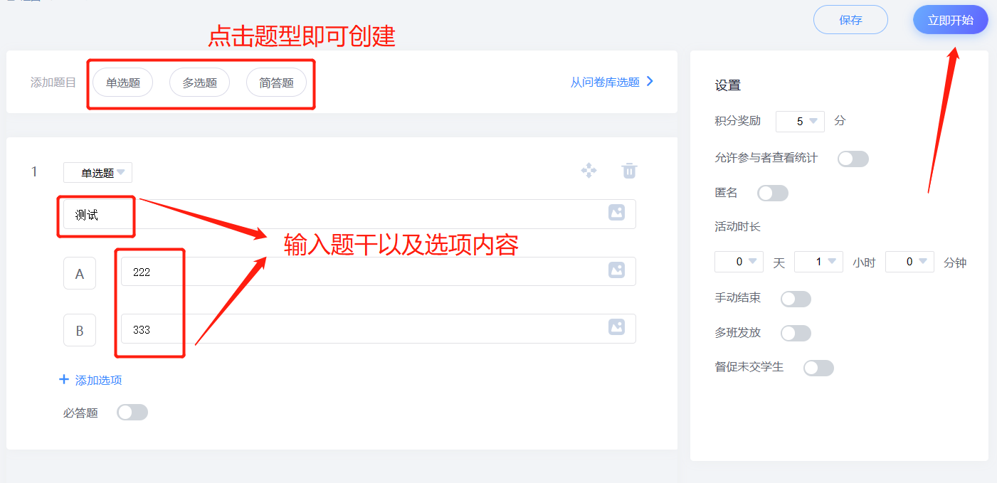 支持单选题、多选题和简答题三种题型。可以设置多道题,每道题也可以自主设置选项数量。支持设置奖励积分/活动时长。