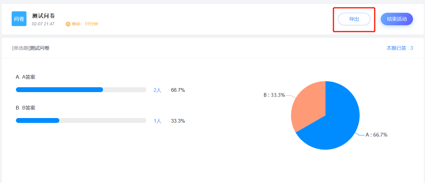 问卷数据实时反馈,可搭配学习通APP投屏进行统计结果展示,支持数据导出。