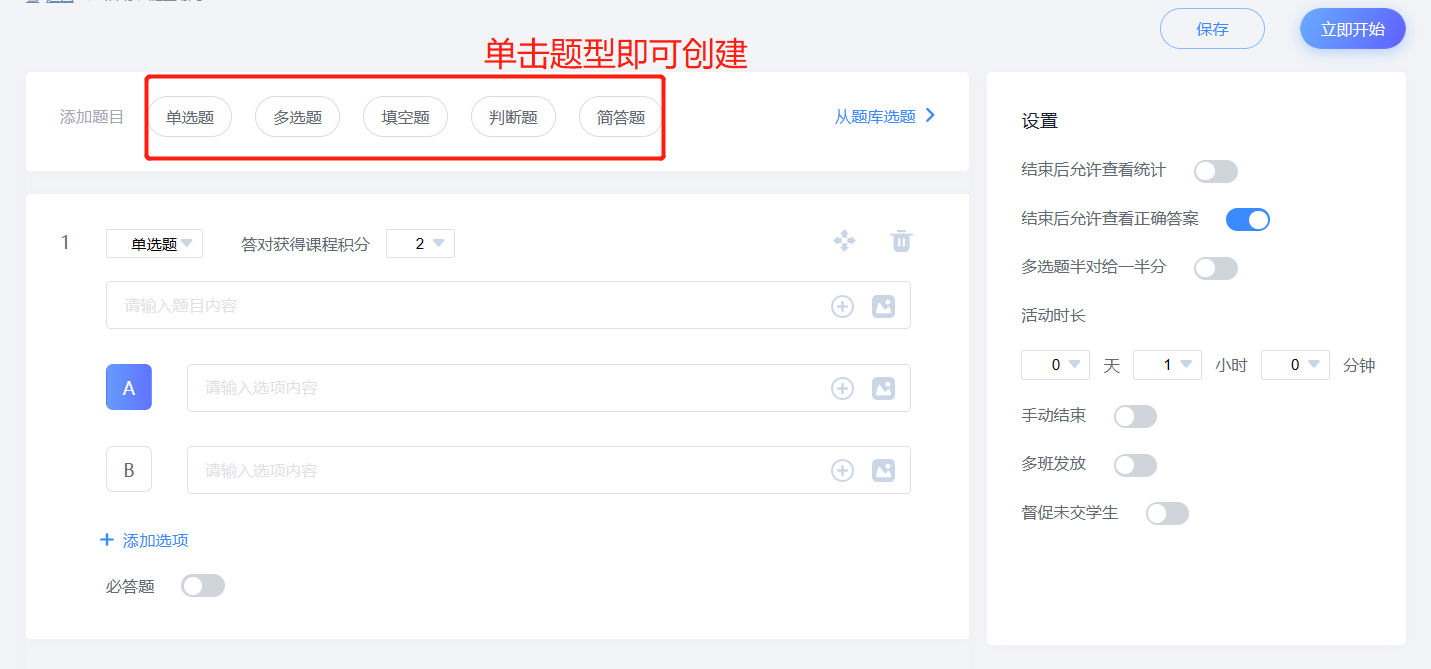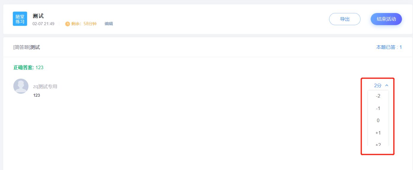 支持题型:选择、填空、判断、简答,可以通过题库进行选题,每个题型单独设置答对得分,得分计入课堂积分。
