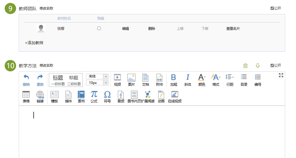 点击“编辑本页”,根据模块对内容进行补充,修改展示模版、教师简介、课程简介等信息,可调整顺序、删除、设置是否公开在课程门户中。