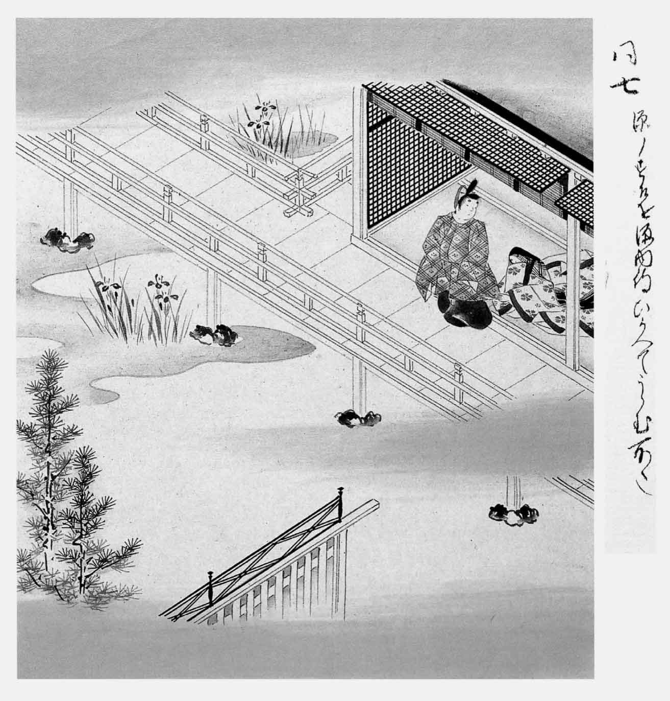 内侍的琵琶忽然停声,想见她正在悲伤愁叹。源氏公子将身靠在柱上,低声吟唱催马乐《东屋》之歌:“我在东屋檐下立……”内侍便接唱下段:“……请你自己推开门……”(18)源氏公子觉得她的歌声的确与众不同。内侍吟诗道: