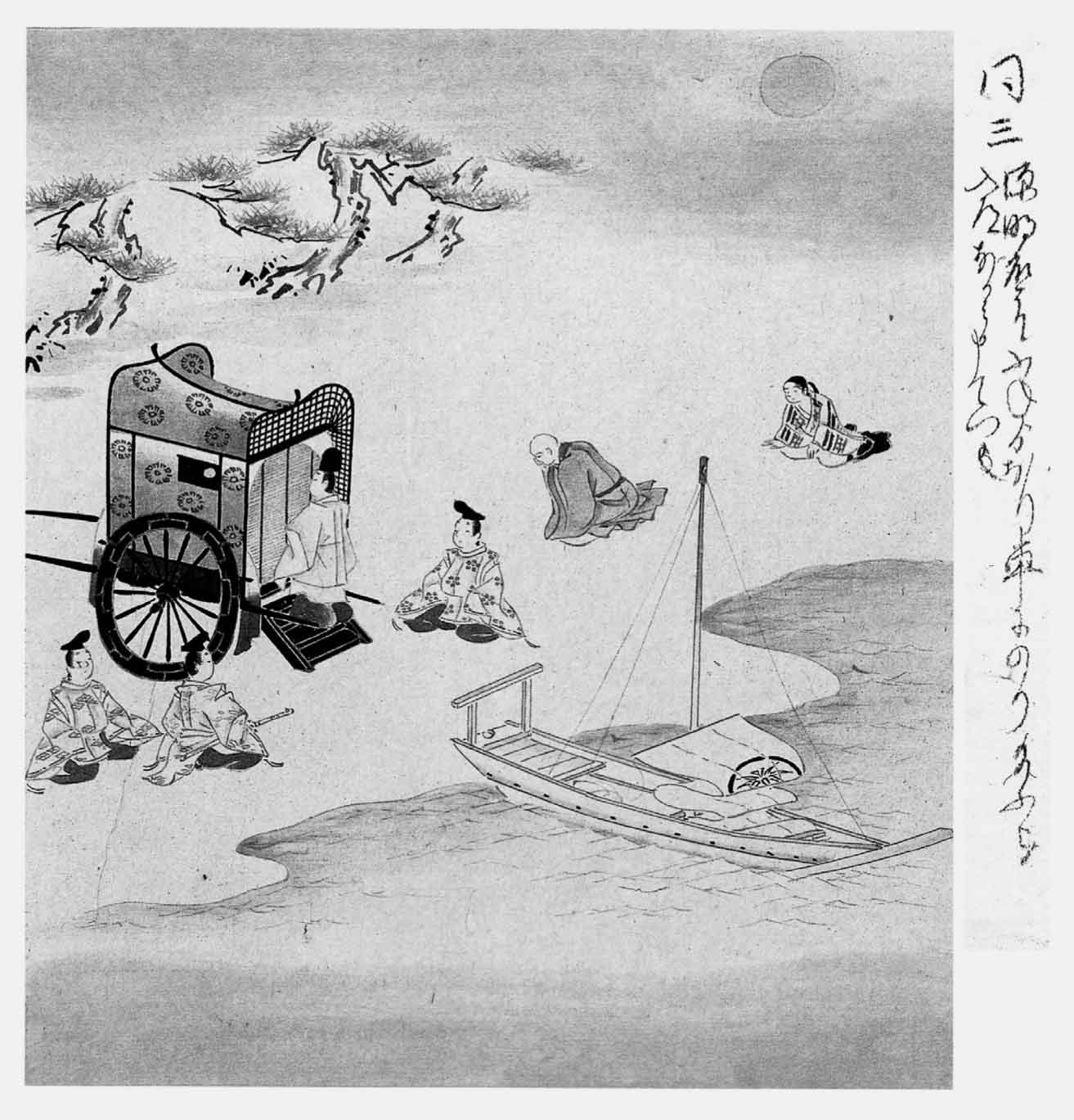 忽见一只小船驶近岸边,有两三个人上岸,向着源氏公子的旅舍走来。这里的人问他们是谁,据回答是前任播磨守明石道人从明石浦乘船来此相访。那使者说:“源少纳言(4)倘随侍在此,敝主人欲求一见,有话面谈。”良清闻言,吃了一惊,对源氏公子说:“这道人是我在播磨国时的相知。虽然交游多年,但因略有私怨,以后音信亦不相通。久无往还,今忽在此暴风雨中来访,不知有何要事?”他觉得很诧异。源氏公子恍悟此事与父皇托梦有关,便命他立刻来见。