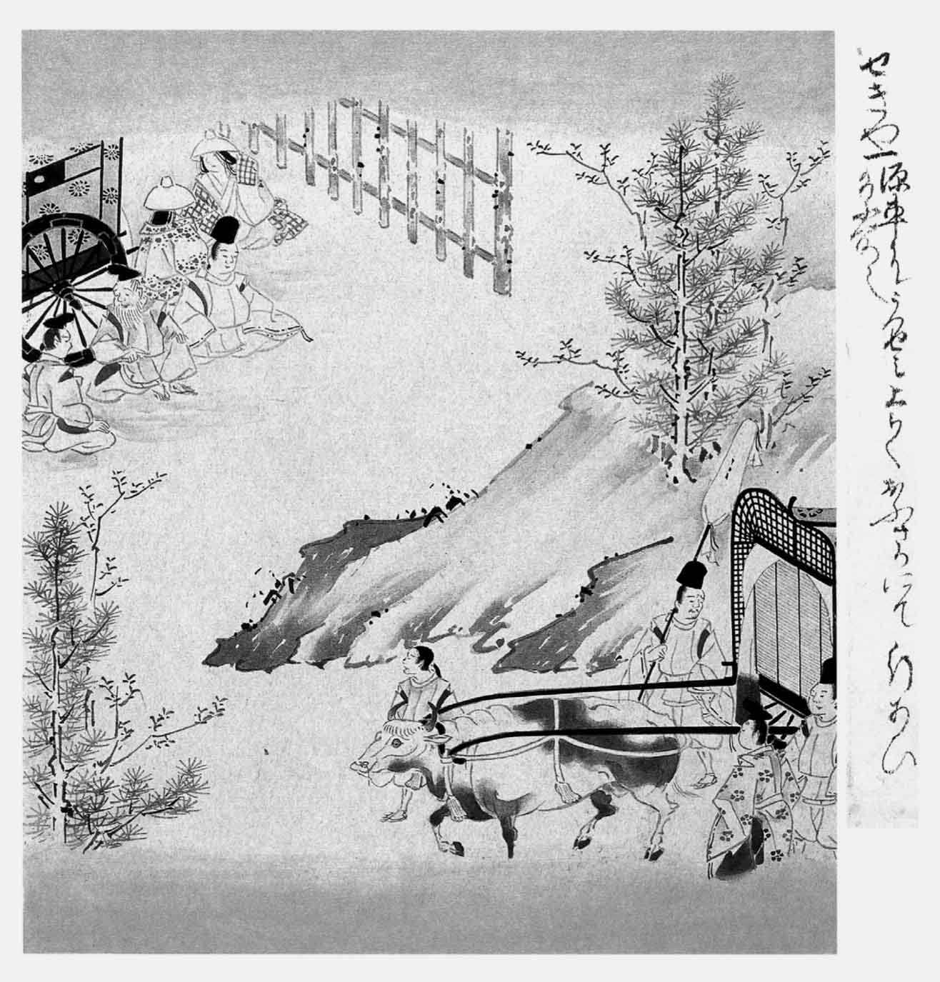 行至打出(2)海边,传闻源氏公子一行已经越过粟田山。这里还来不及避让,公子的前驱者已经蜂拥而至了。于是常陆守一行人等只得在关山地方下车,把车子驱进各处的杉木林中,卸了牛,支起车辕,人都躲在杉木底下,仰望源氏公子一行经过。伊豫介一行人的车子,有的还在后面,有的已经先行。然而眷属为数甚多,这里也还有十辆车子,各色各样的女衫襟袖,露出在车帘底下,一望而知乘在车里的不是乡下女子。源氏公子看了,觉得这很像斋宫下伊势时出来看热闹的游览车。源氏公子重新获得了世所罕有的尊荣富贵,因此前驱之人多不胜数。他们都注目这十辆女车。