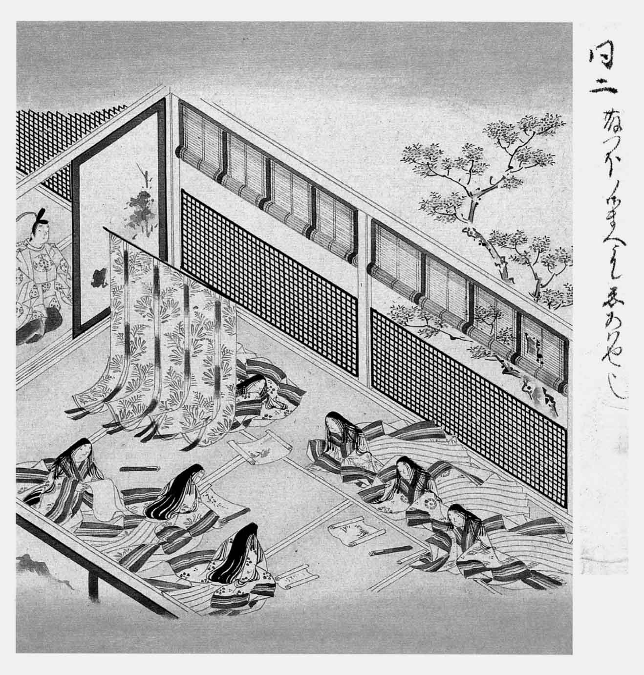 藤壶母后也打开了御膳堂的纸隔扇,在一旁观赏。这位母后深通画道,她今天出席,源氏内大臣甚感欣慰。帅皇子每逢难于判断之时,便时时向她请教,得益甚多。