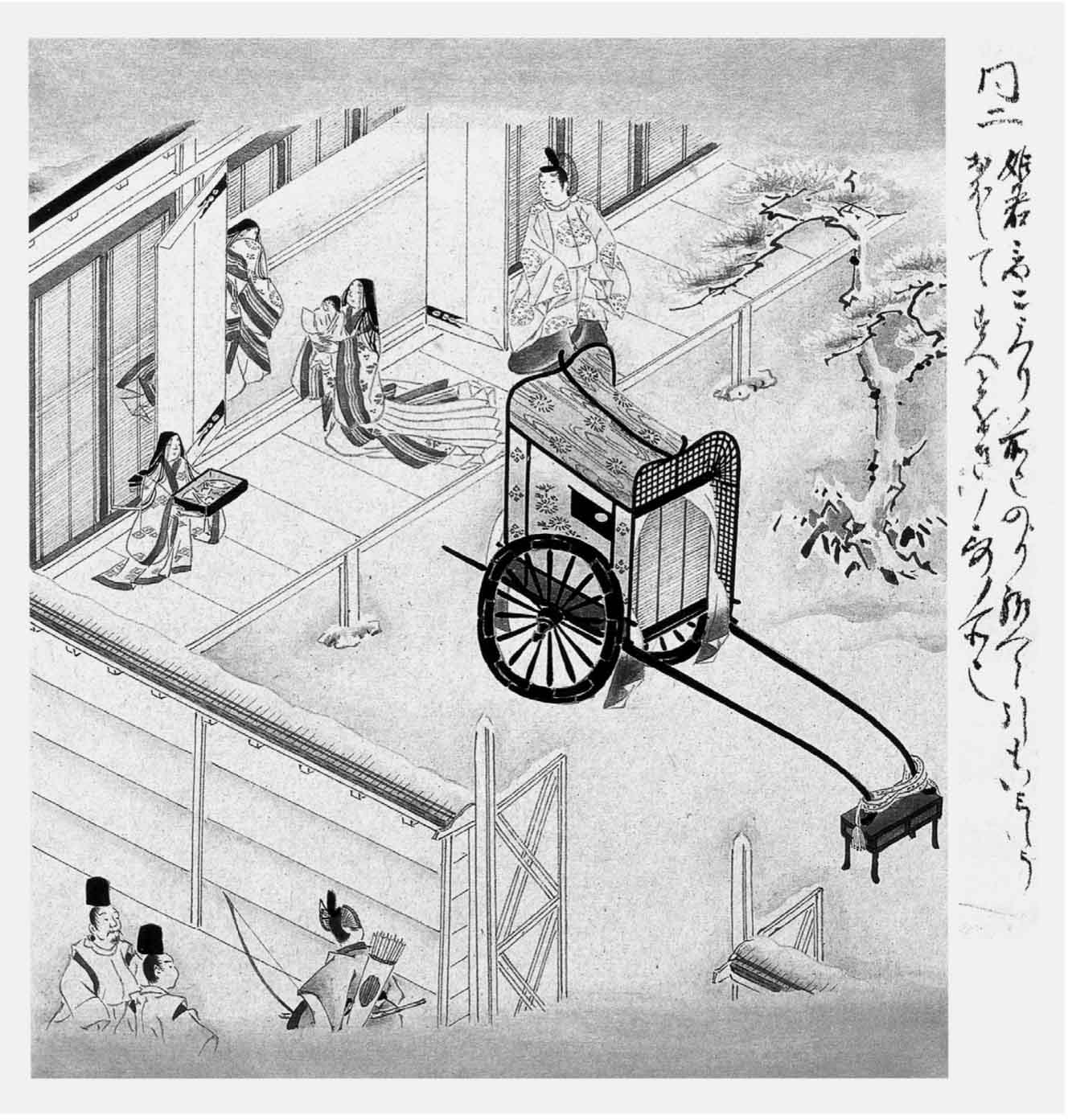 转瞬之间,秋尽冬来,大堰河畔的邸宅里越发冷落萧条,明石姬母女寂寞无聊,空度岁月。源氏公子劝道:“在这里到底过不下去,不如迁居到我近旁来吧。”但明石姬想:“迁居到那边去,生怕‘