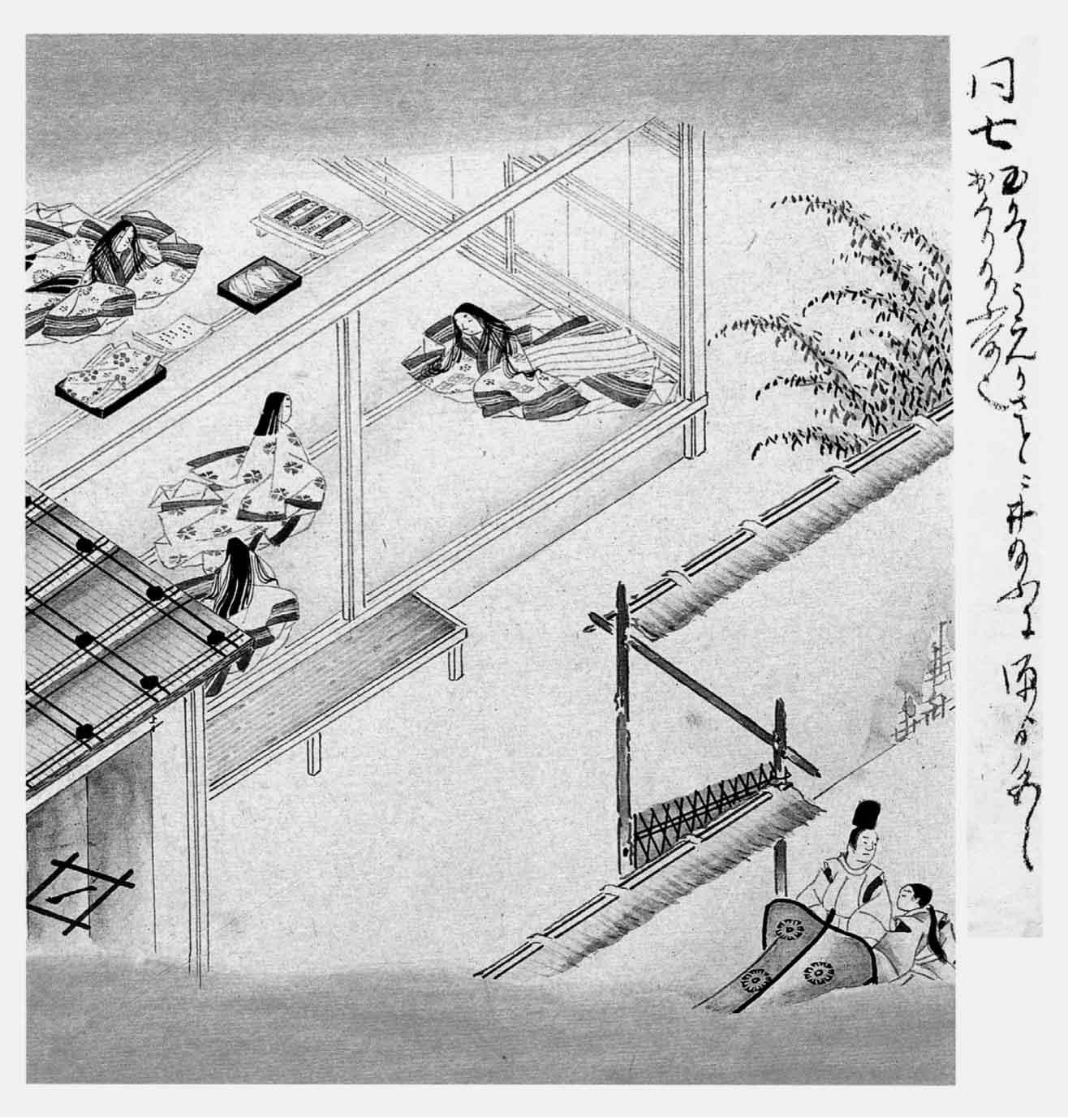 以上所述,是源氏三十五岁上九月中之事。玉鬘迁入六条院一事,不能立刻实行,先要访得几个优良的女童和青年侍女。在筑紫时,有些面貌端正的侍女从京都流离到该地,乳母家便托人介绍,雇用了几名来服侍玉鬘。后来仓皇逃出之时,此等侍女都不曾带走,所以现在一个人也没有。京中地广人多,有些女商之类的人,顺利地找得了几个侍女,给送上门来。对于这些新来的侍女,都不让她们知道小姐是谁家的女儿。先把玉鬘悄悄地带到五条地方右近家里,在这里选定了侍女,备办了装束,然后于十月中迁入六条院。