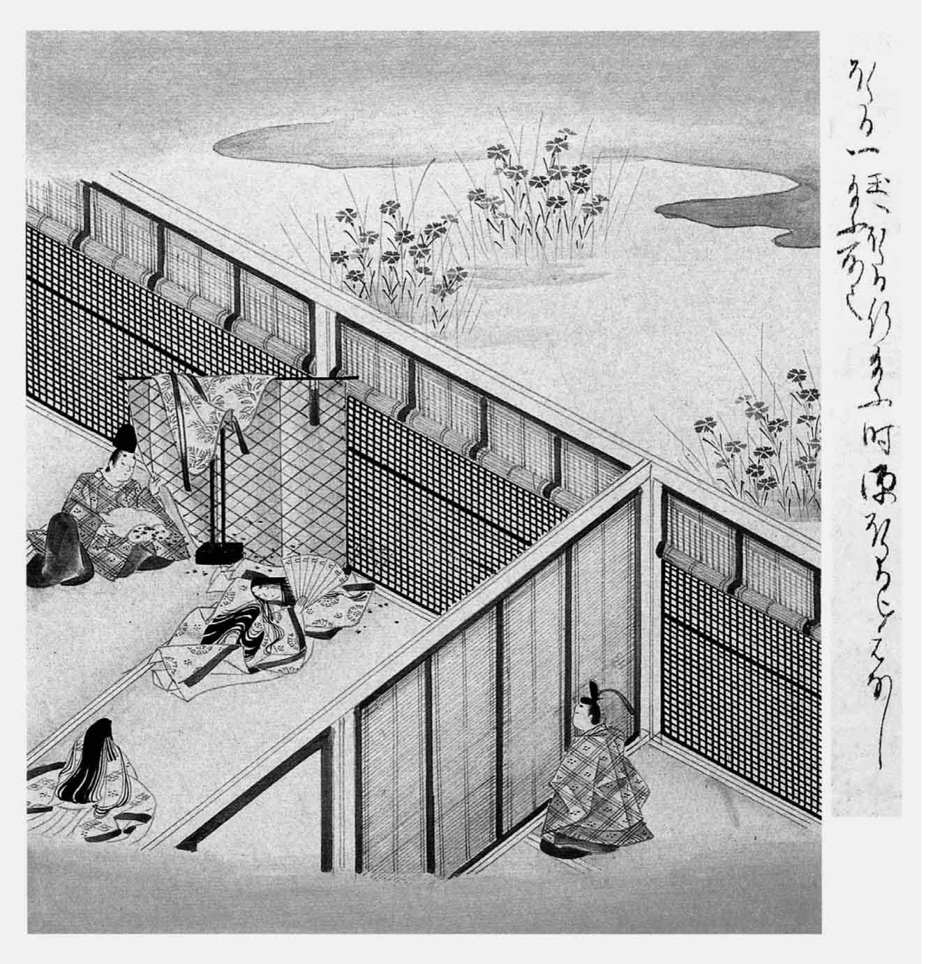 玉鬘生来笑容满面,和蔼可亲。所以虽然性格非常谨严,仍有娇艳可爱之相。因此兵部卿亲王等真心诚意地向她求婚。亲王为她劳心,日子还未长久,却已经到了不宜嫁娶的五月(2),因此写信向她诉苦:“务请许我稍得接近芳容,当面诉说,亦可聊以慰我相思之苦。”源氏看了这信,说道:“这又何妨!此等人向你求爱,乃是一件美事。切不可置之不理。应该常常写回信给他。”便想教她回信如何写法。然而玉鬘非常厌恶,推说今天心绪不好,不肯写回信。玉鬘身边的侍女中,本来没有出身特别高贵而才能优越的人。只有一人,是她母亲的伯父宰相的女儿,其人略具才能,家道衰落之后沉沦世间,后来被寻找出来,在此当侍女,人都称她为宰相君。这宰相君写得一手好字,人品也大致不错,所以向来有需要时,总是叫她代笔。此时源氏便召唤这宰相君前来,亲自口授,叫她代写回信。他之所以如此安排,大约是想看看兵部卿亲王与玉鬘谈情的模样。玉鬘本人呢,自从遭逢了那件不快之事以后,收到兵部卿亲王等的缠绵悱恻的情书时,也多少用心看看。但并非心有所爱,只是为了要摆脱那种不快的缠绕,才采取了这样的态度。