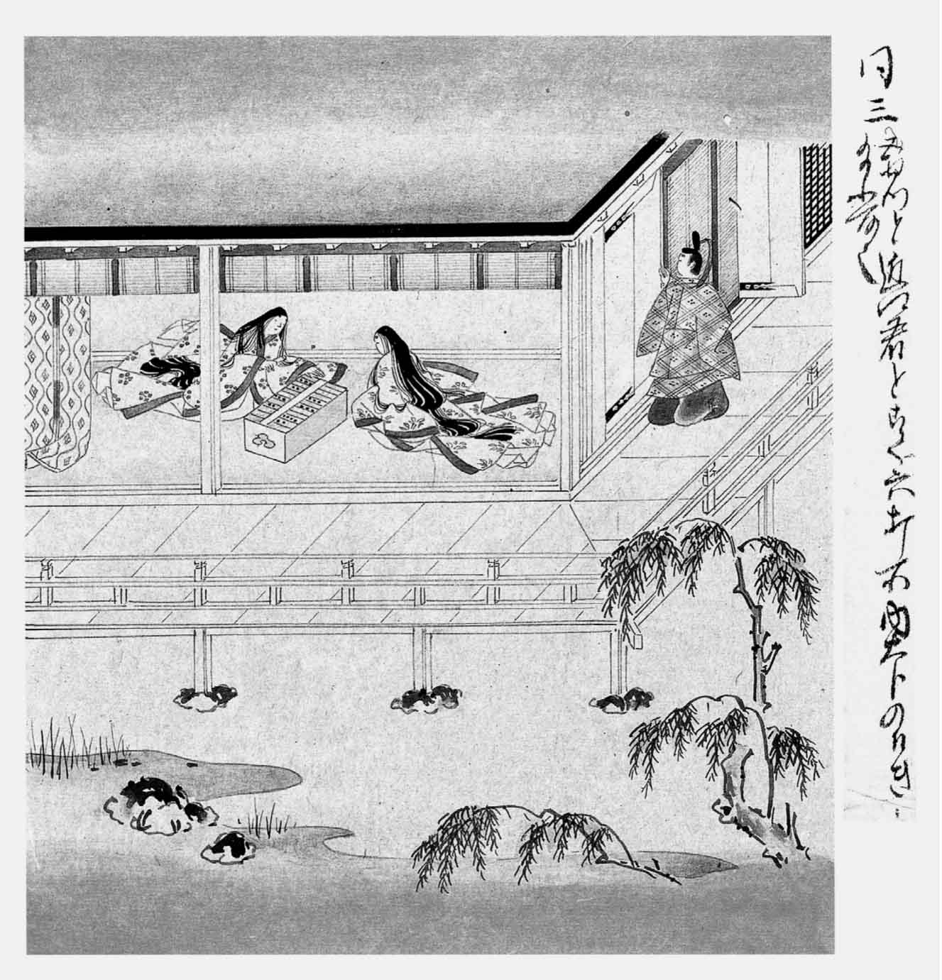 内大臣见过弘徽殿女御之后,乘便到北厅去探望近江君。走到门口,向内一望,但见帘子高卷,近江君正在和一个伶俐的青年侍女五节君打双六(12)。她焦灼地揉着手,快嘴快舌地叫喊:“小点子,小点子!”内大臣见此模样,想道:“啊呀,不成样子!”便举手制止了先驱的随从人等,独自悄悄地走到边门旁,向门缝里窥探。正好纸隔扇开着,可以分明看到室内情状。但见五节君也尖声尖气地叫道:“还报,还报!”摇着骰子筒,不肯立刻掷出。内大臣想:“不知道这女子作何感想。”两人的模样都很轻佻。近江君面部扁平,然而相貌也很娇美,头发光艳可鉴,足见前世果报不恶。只是额角生得太低,声音异常浮躁,这就抵消了其他一切优点。相貌很像父亲,虽然不能分明指出肖似之处,但一望而知其为父女。内大臣对镜自视,也觉得很像,不免自叹宿世孽缘。他就走进室内,对近江君说:“你在这里住得惯么?有否不方便之处?我事务烦冗,不能常来看你。”近江君照例快嘴快舌地答道:“我今住在这里,无忧无虑,心满意足。只是回想多年以来,不能会见爹爹,日日思念,夜夜梦想,常是不能见面。那时真好比打双六手运不好,气死我也!”内大臣说:“是啊,我身边不大有可供使唤之人,早就盼望你来,也可慰我寂寞。然而这也不是容易办到的啊。如果是一个寻常出身的侍者,杂在众人之中,不管其人言行这样或那样,未必入人耳目,惹人注意,倒可放心。即使这样,也还有顾虑:如果别人知道这是谁家之女,谁人之子,则言行设有不端,父母兄弟便失面子,此种事例甚多。何况出身不寻常的人……”说到这里,含糊其词。然而近江君不解父亲的苦心,率尔答道:“不打紧,不打紧,我什么都不计较。把我看得太重,叫我当小姐,我反而拘束。我情愿替爹爹倒便壶。”内大臣听了这话,忍不住笑起来,说道:“这种活儿不配你做!你对难得见面的父亲如果有孝心,以后说话时声音稍稍缓和些。倘能如此,我的寿命也可延长了。”这位大臣善于滑稽,带着笑容说这话。近江君说:“我的舌头是天生成如此的呀!我从小就这样,我那已故的妈妈常常苦苦地叹息着告诉我:‘你出世时,妙法寺(13)那个快嘴快舌的长老走进我产房里来念经,你便肖似了他。’妈妈很替我担心呢。我总得想个法子改了这毛病才好。”内大臣也很替她担心,但听了这话,觉得她确有一片十分深挚的孝心,便对她说:“走进产房里来念经的长老,不是个好人。他有这毛病,正是前世罪孽的报应。犹似哑巴和口吃,是毁谤大乘经典的报应。(14)”