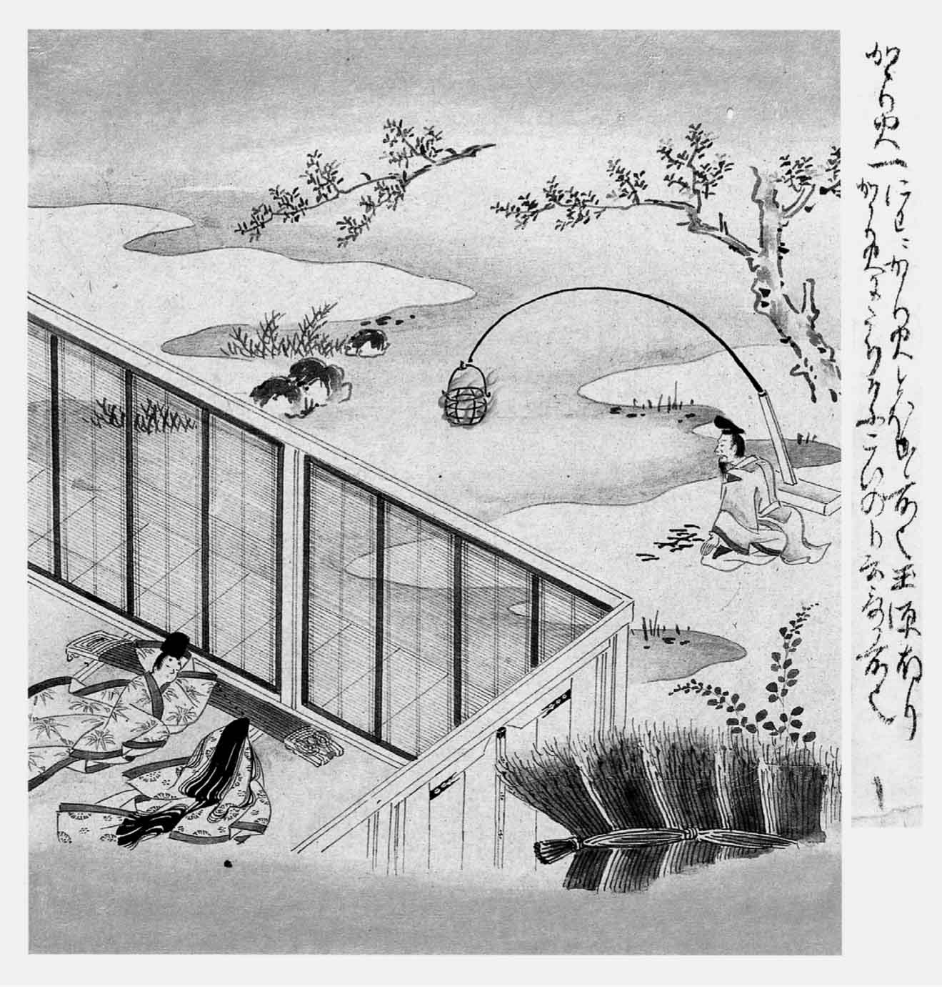 夏尽秋来,凉风忽起。源氏想起了古歌“吹起我夫衣……”(2)之句,颇有萧条冷落之感,难于忍受,便频频地前往探望玉鬘,镇日住在那里,有时指导她弹琴。初五六日的月亮很早就已西沉。略微显得阴暗的天空、风吹荻花的声音,都渐渐地含有秋意了。源氏与玉鬘二人以琴作枕而并卧。他心中时时叹息又自问:“如此纯洁的并卧,世间哪有其例?”过分夜深,生怕惹人疑议,便起身准备回去。庭前有几处篝火已经熄灭,源氏就召唤随从的右近大夫,叫他点火。凉气四溢的湖边,亭亭如盖的卫矛树底下,疏疏朗朗地点着松明,离开窗前稍远,室内不受热气。那火光显得很凉爽,照在玉鬘身上,姿态异常艳丽。源氏摸摸她的头发,觉得滑润如玉,雅洁无比。温恭淑慎的姿态实在可爱,逗得他不肯回去了。假意说道:“应该不断地有人在这里点火才是。夏天没有月亮的晚上,庭中没有火光,教人觉得害怕,而且寂寞无聊。”便赋诗赠玉鬘: