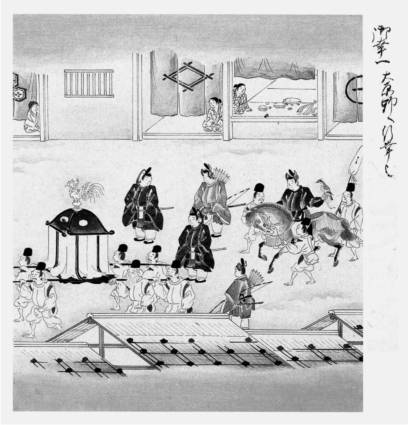 妇女们不甚懂得鹰猎之事,只因难得见到,而且光景好看,所以争先恐后地观赏。其中也有身份微不足道的人,乘着蹩脚的车子,半路上车轮损坏了,正在周章狼狈。桂川上的浮桥旁边,也有许多风流潇洒的高贵女车,正在彷徨着找寻停车之处。