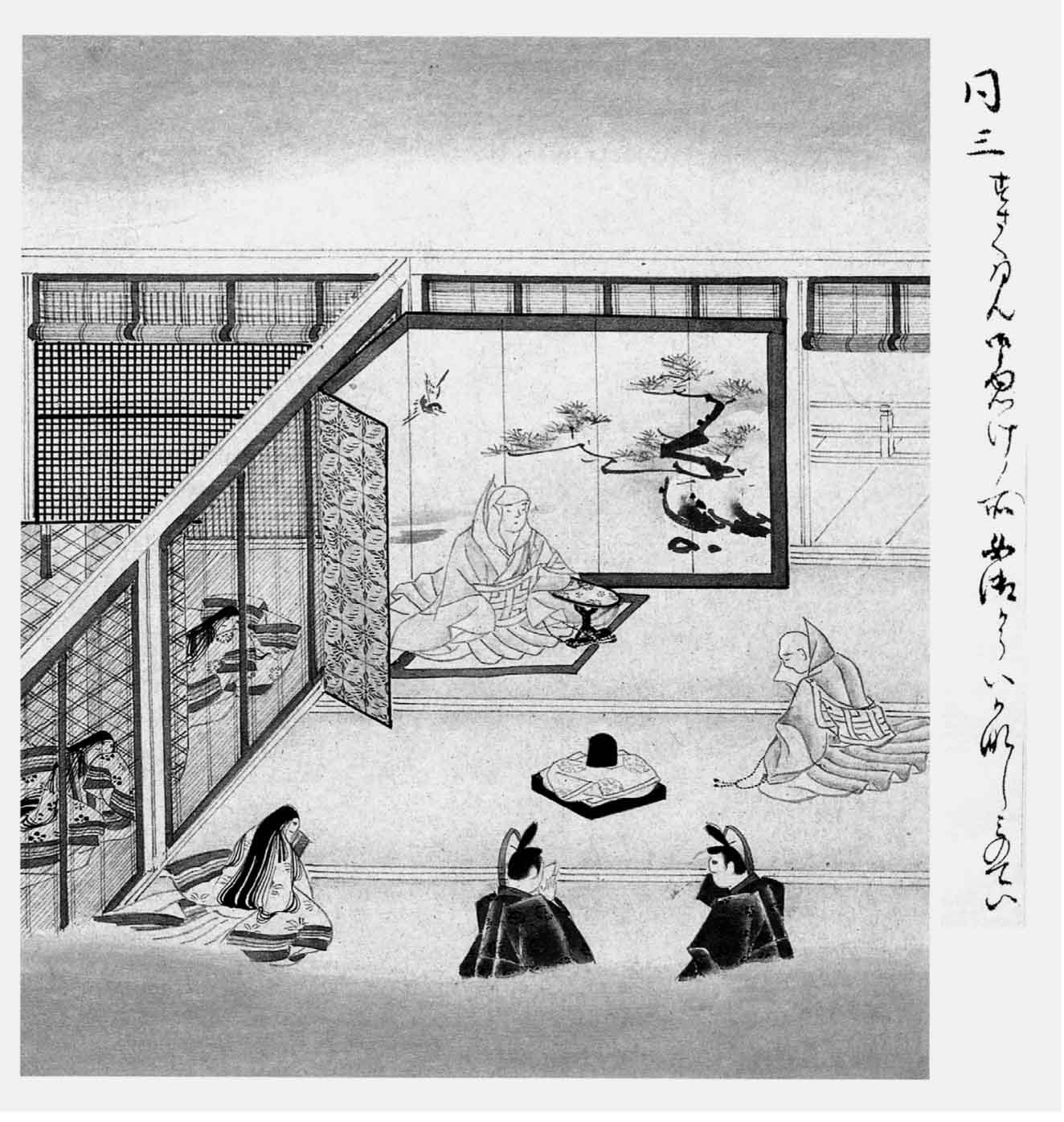 第二天照往日习例,起身很迟。源氏写一信送与三公主。三公主年纪还小,不会计较,但源氏写信也仍讲究笔墨。他写在一张白纸上,诗曰: