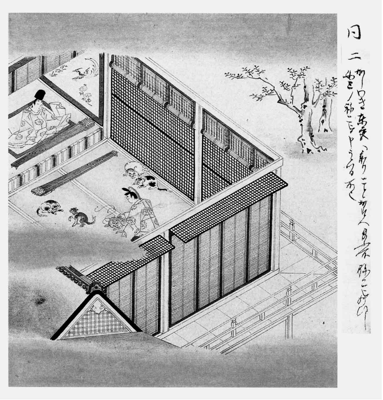 暂时蒙眬入睡,柏木做了一梦,梦见他所养驯的那只中国猫,娇声地叫着向他走来。他想,这是他带来送还三公主的,但又寻思为什么要送还她。忽然惊醒,他想:“这梦是什么意思呢?(37)”三公主惊恐万状,似觉这不是现实之事,悲愤填塞胸中,不知如何是好。柏木对她说道:“你须知道:这总是不可逃避的宿世深缘。我自己也不相信这是事实。”便把那天傍晚在三公主不提防之中小猫的绳子掀起帘端之事讲给她听。三公主闻有此事,深悔疏忽,觉得自身命运太苦。她想:“今后有何面目再见源氏主君呢!”便悲伤凄楚地啜泣起来,竟像一个小孩。柏木觉得万分对她不起,也很悲伤,便用自己拭泪的衣袖来替她拭泪,那衣袖越发濡湿了。