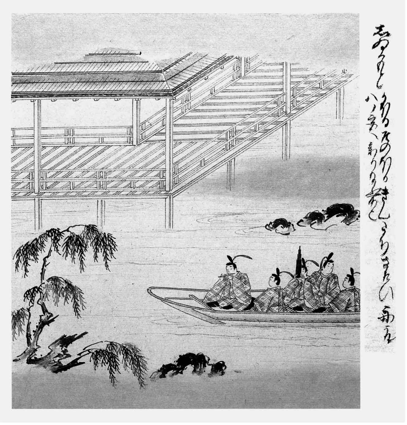 此间但见长空无际,春云叆叇。樱花有的已经零落,有的正在吐艳,各擅其美。川边垂柳迎风起伏,倒影映入水中,优雅之趣,异乎寻常。在这难得看见野景的京中人看来,实在非常珍异,难于抛舍。薰君不肯错过这个时机,意欲前往访问八亲王。又念避去许多人目,独自驾舟前往,也不免过于轻率。正在踌躇不决之际,八亲王遣使送信来了。信中有诗云: