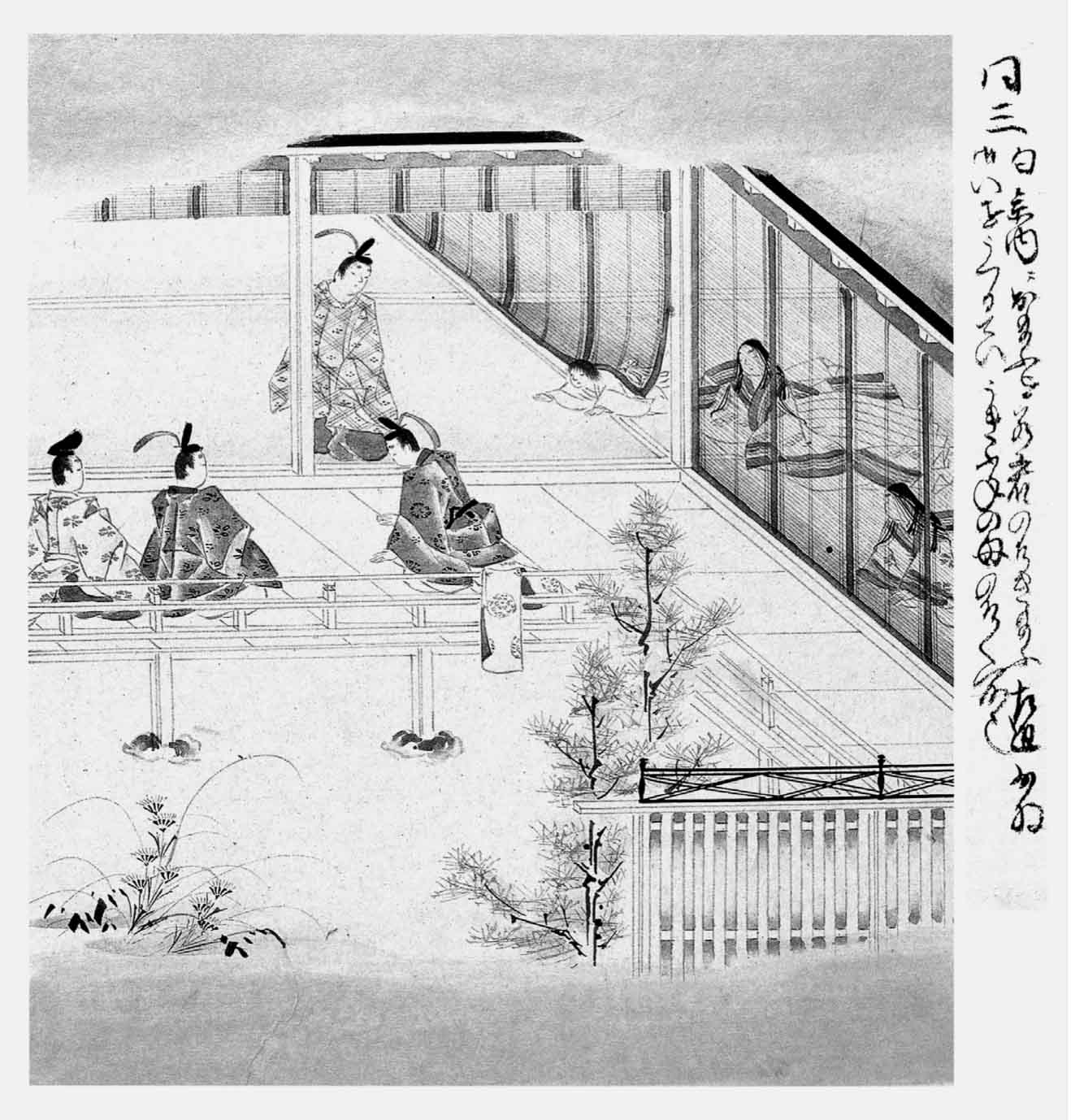 常陆守为了款待新女婿左近少将,忙得不亦乐乎。他埋怨夫人,说她不肯和他同心协力,有损体面。夫人气得很,她想:“都是此人不好,惹起这许多纠纷。”她所最疼爱的女儿为此而遭受苦患,使她痛心疾首,因此全不把这女婿看在眼里。她回想前几天看见这少将在匂亲王面前,形容猥琐得不像一个人,因此十分看不起他,奉他为东床娇客的念头早已打消。但她想:“不知他在这里怎样,我还没有看见过他日常晏居时的模样呢。”就在有一天昼间,当少将闲居在家之时,走到他的房间旁边,向隙缝中窥探。但见他身穿柔软的白绫上衣,内衬鲜艳的砑光淡红梅色衫子,正坐在窗前欣赏庭中花木。她觉得此人姿态也还清秀,并无拙劣之相。那女儿还很稚气,无心无思地靠在一旁。她回想匂亲王和二女公子并坐时的模样,觉得这一对夫妻毕竟逊色得多。少将和身边几个侍女谈笑戏耍起来。夫人细看他那随意不拘的姿态,觉得不像以前在二条院看到时那样丑陋不堪入目。她疑心那天看到的是另外一个少将。正在此时,忽闻少将说道:“兵部卿亲王(22)家里的萩花真是特别好看!不知是哪里来的种子。同是花枝,他家的格外艳丽。前天我到他家,想折取一枝。但亲王正好要出门,我终于不曾折得。那时他还吟唱着‘褪色萩花犹堪惜’(23)之歌。我真想叫年轻的女子看看他那时的丰采呢!”说罢,他自己也吟唱些诗歌。夫人在心中讥诮他:“算了吧!我想想此人品性之卑鄙,觉得不像个人;看看他在匂亲王面前时的丑陋,实在令人难堪。不知他在吟唱什么诗歌。”然而看他此时模样,毕竟不是全不知趣的人。她想试试他的才能,便命侍女传言,赠以诗曰: