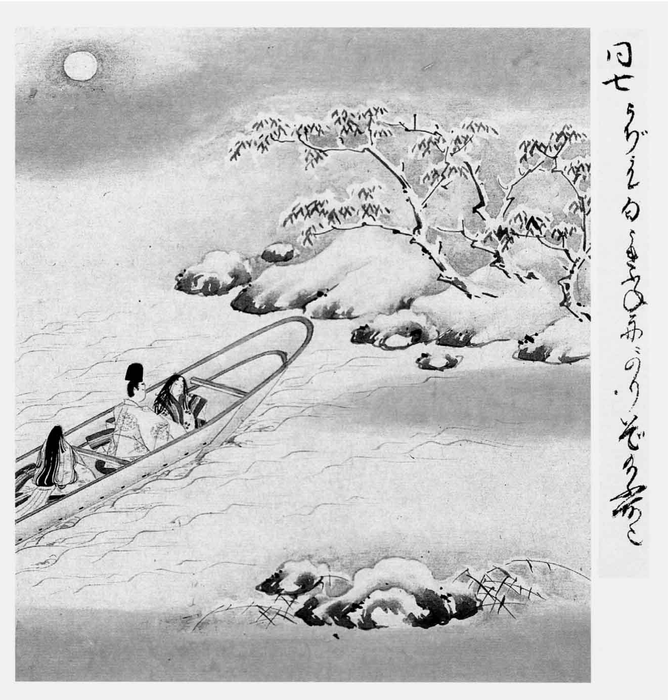 不久小舟到达对岸。下船之时,匂亲王舍不得把浮舟让别人抱,便亲自抱了她上岸,而叫别人扶持自身。看见的人想道:“这样子真难看啊!这女子毕竟是谁,值得如此宠爱?”这屋子是时方的叔父因幡守领地内的别庄,建筑不甚讲究,而且尚未竣工。因此设备亦颇简陋,那些竹编屏风等,都是匂亲王从未见过的粗货,风也不能全防。墙根的雪已经消融得斑斑驳驳,但此时天色阴晦,又下雪了。