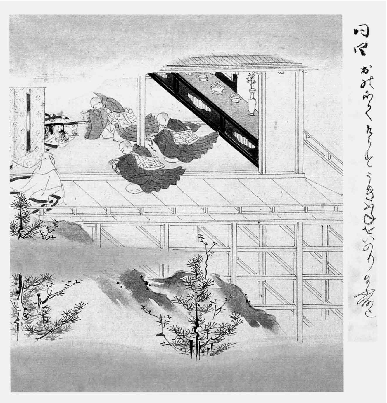 帘内众女子,都不省得浮舟真心不欲使外人知道她还意外地活在世间,又回想过去,觉得这男子和已故的小姐一样可惜可恋,便对浮舟说道:“今天偶尔逢此机会,和这中将说几句话,决不会有意外的后患。你可全然不动风情之念,只作知情识趣的样子,讲几句普通应酬话就是了。”她们想打动浮舟的心。这些女子虽然当了尼姑,毕竟没有老成持重之心,都爱好时髦,有时还唱唱粗劣的恋歌,装作少女模样。因此浮舟很担心,深恐她们会放进那男子来。她想:“我已命里注定是个最苦恼的人,又不幸而苟延残喘,将来会沦落到什么地步呢!我但愿别人都看不见我,听不到我,完全把我遗弃吧。”她便倒身横卧着。那中将大约另有伤心之事,沉痛地叹息,低声地吹笛,又独吟“鹿鸣凄戚”(13)之歌,确是很有风趣的人。后来恨恨地说:“我因思念故人而来此,却不道来了反而伤心。今已无法找到可慰我情的新欢,可知这里不是‘无忧山路’(14)!”说罢就想回去。妹尼僧说:“何不在此欣赏这‘良宵花月’(15)?”便膝行而出。中将没精打采地答道:“有什么可欣赏呢?我知道这里不是可慰我情的地方。”他想:“过分留恋女色,毕竟不成体统。我只是因为曾经瞥见那女子的姿态,想借此慰我悼亡之情。但这女子过分拒远我,好像是深闺里的千金小姐,和这草庵生涯甚不相称,也很乏味。”就准备回去。妹尼僧十分惋惜,想起他的笛声也觉得可恋,便赠诗曰: