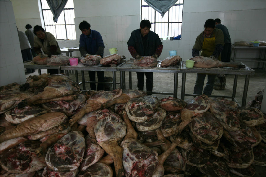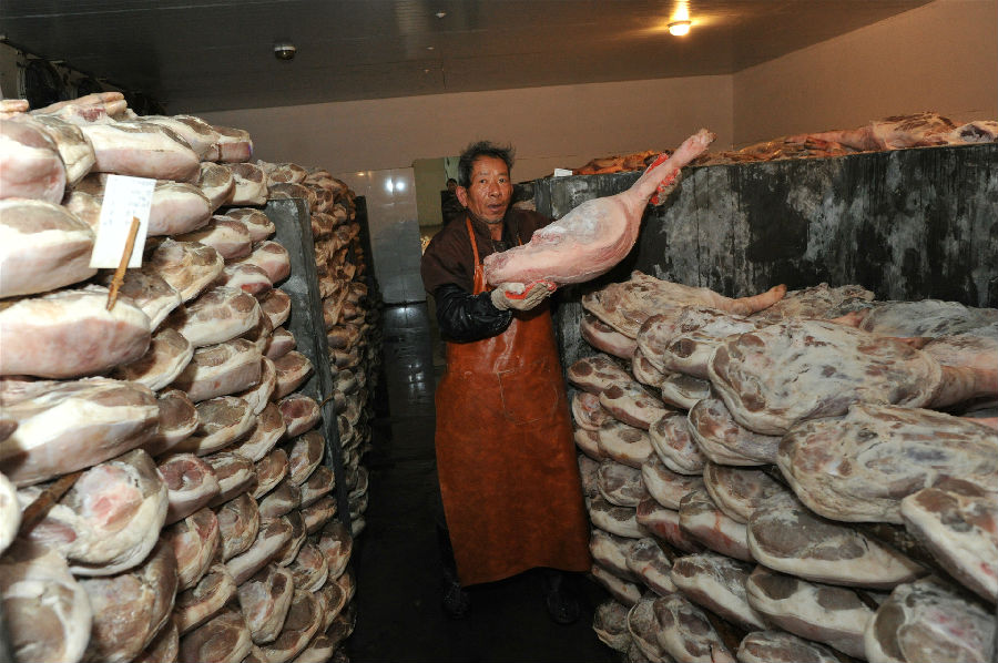 堆码翻压——上盐后的火腿经过一段时间的翻盐以便排尽淤血保证火腿质量。