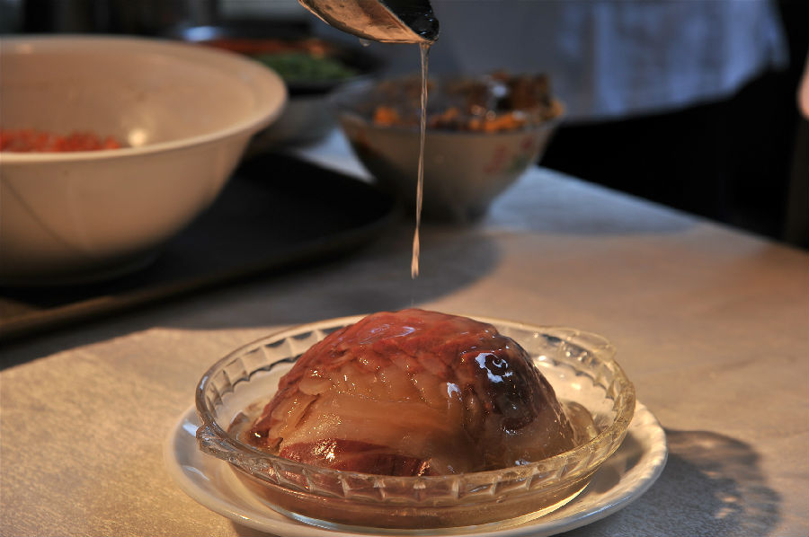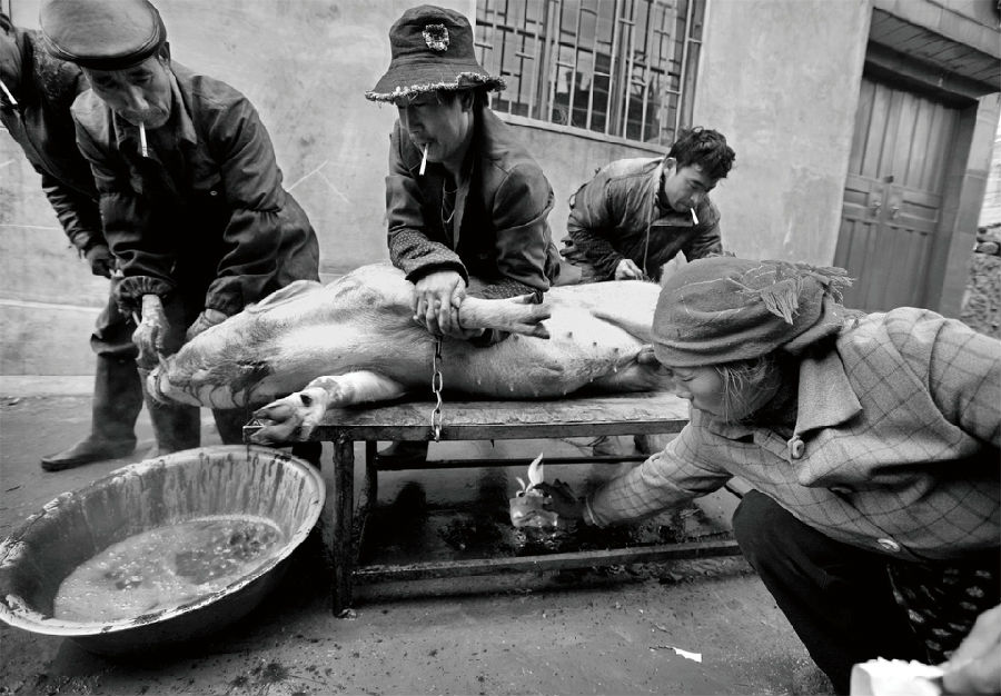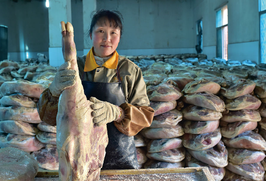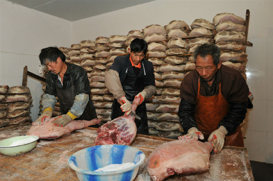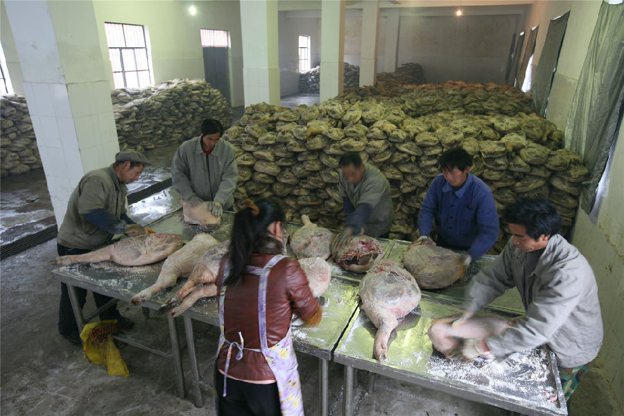上盐腌制——上盐时从蹄壳开始逆毛孔而上,从皮面至肉面上盐反复揉搓。