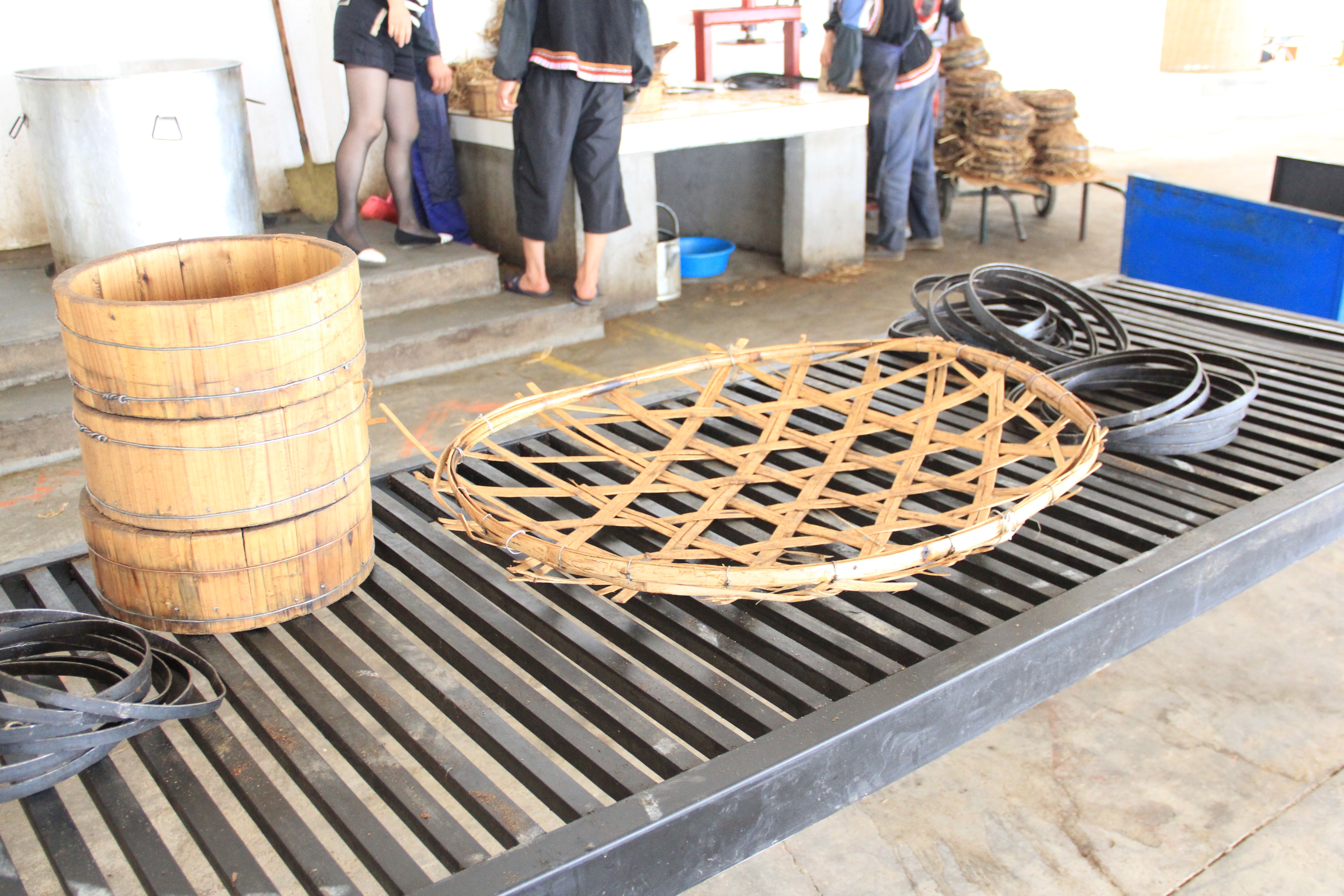 “依鲁古法榨油坊”由布依族传统的水车、石碾子、灶台、铁锅、木蒸笼、包饼桶、铁枯圈、木头榨筒、楔子、抵板、撞锤、石盆、木制油桶等传统古式榨油工具组成古法榨油生产线。现有大型水车一台,大型石碾子一组4个,木蒸笼4个,木头榨筒4套(还将建6套),石盆4个,木制油缸、沉淀罐14个,成品油储存罐2个,灌装机一套,清洗设备一套,有全套油脂分析化验设备设施。完全满足油脂生产及检验设备要求。
