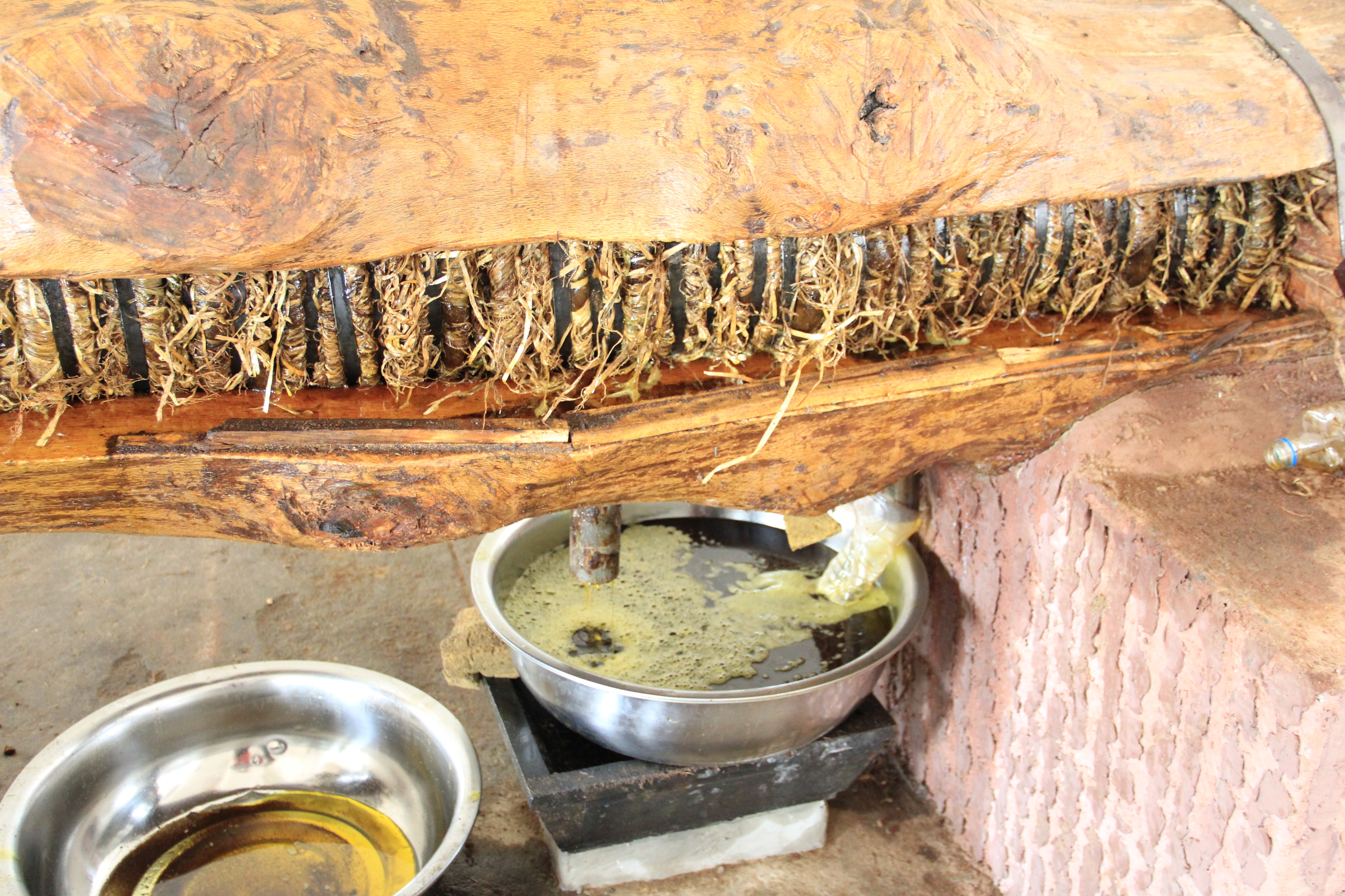 木榨取油。将箍好的油饼迅速装入榨筒内,用抵板抵牢,加入楔子,用长达3米的撞锤有节奏的冲击前进楔,对油饼加压进行压榨直到出油为了耐用和出力,要在撞锤和楔子接触的一头包上铁皮;榨出的油经过“木榨”中空部位下方的凹槽流经开好的孔洞,淌到下面放好的石盆内,石盆中部凿通有孔,接有油管,直通地下的铁制油罐内,这就是毛油。