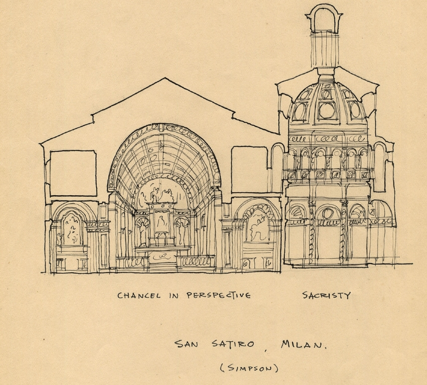 米兰圣萨蒂罗教堂圣母礼拜堂的圣坛透视图、圣器收藏室剖面图