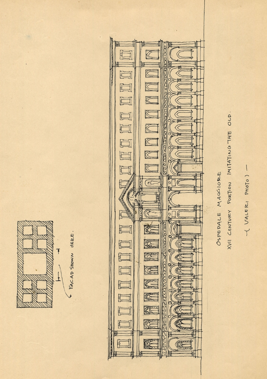 大约在1485年,布拉曼特接手了这所医院的设计建造。当时,他一方面要为威尼斯大使们绘制草图,建造房屋,同时还要完成医院第二层右翼的设计建造。菲拉雷特的接任者又将建筑风格改回到哥特风格。他开始动工建造大型庭院,但是拱廊被弗朗切斯科·里基诺(Francesco Ricchino)推翻,仅有庭院一侧赤陶土的栏杆和列柱得以重建。
