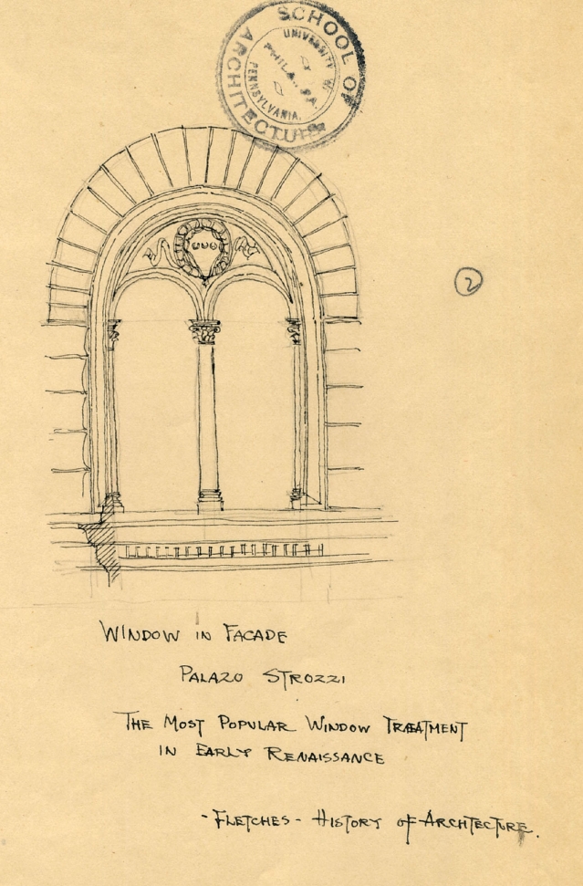 下页图为佛罗伦萨斯特罗奇府邸的窗户正面图,这是文艺复兴早期最流行的窗户样式