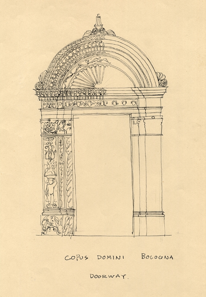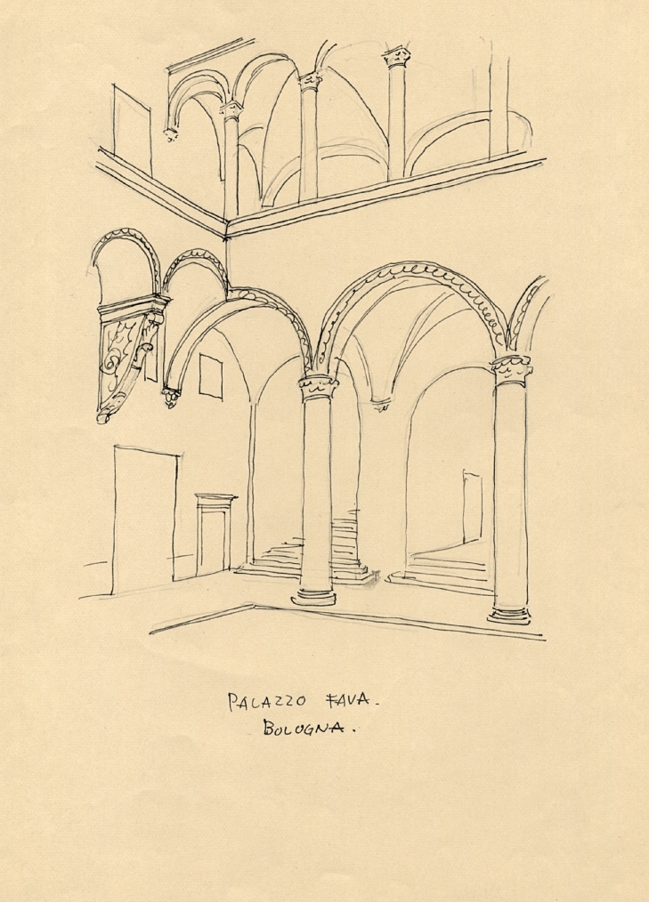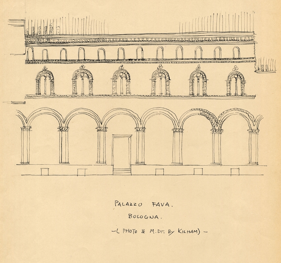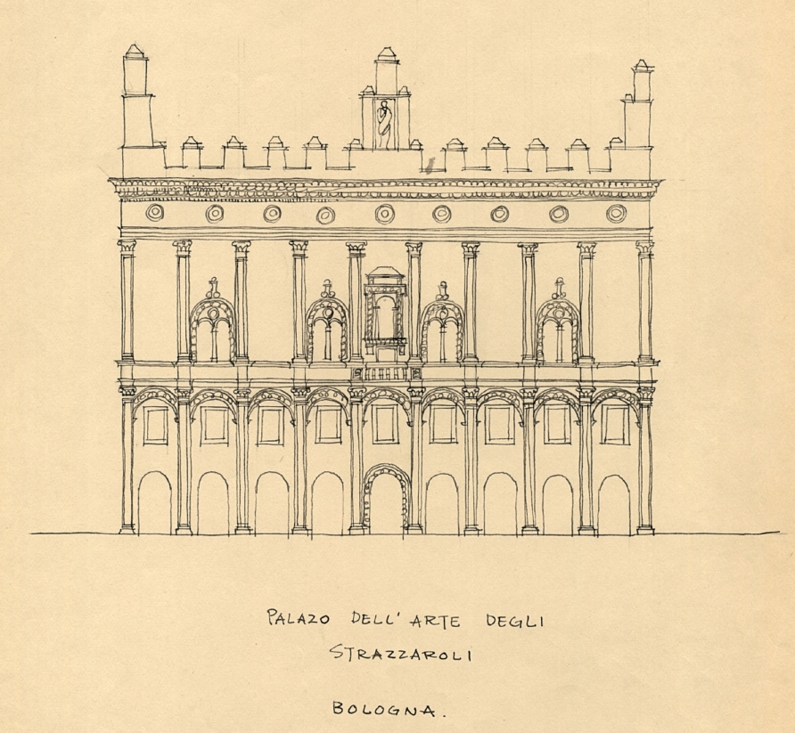 在博洛尼亚,有一件非常不好的事情是采用劣质的石块雕琢建筑精美的细部。多面的小石块并不十分显好,反而是杂色、多变的。建筑的窗户比例精致,注重细节。建筑的尽头是威尼斯风格的壁柱。