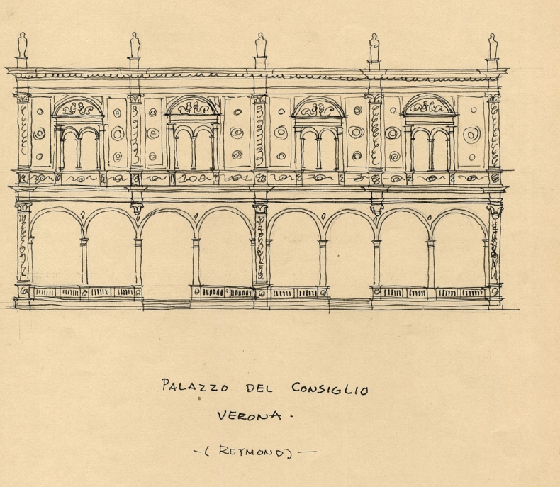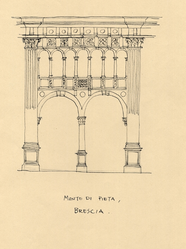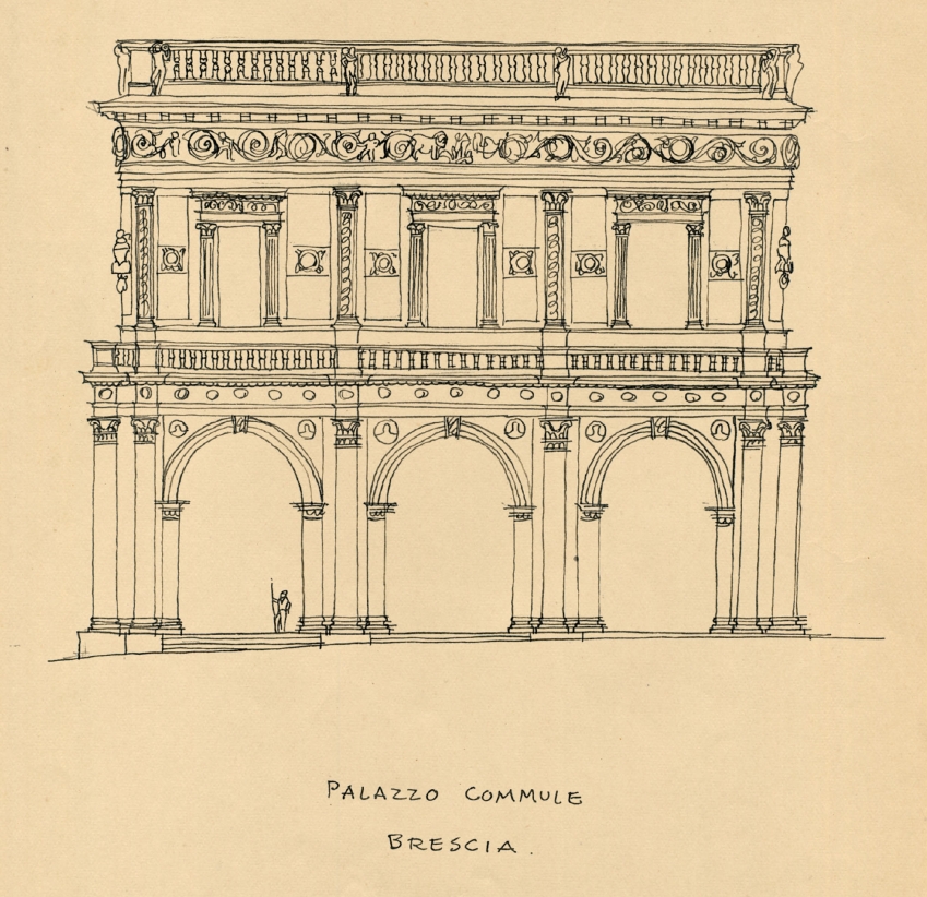 这是一个具有双层特征的典型建筑,议会大厦的第一层由壁柱隔开,每一个开间被分成4个小单元。没有将柱子放在轴线上,这一点在当时几乎是在无视规则。第二层的柱式和窗户的上方覆盖着半圆形的山形墙,窗户由两扇拱形窗门组成。在维罗纳,人们喜欢这种类型的窗户,这种设计来自古罗马遗迹。布雷西亚(Brescia)有三处遗迹。