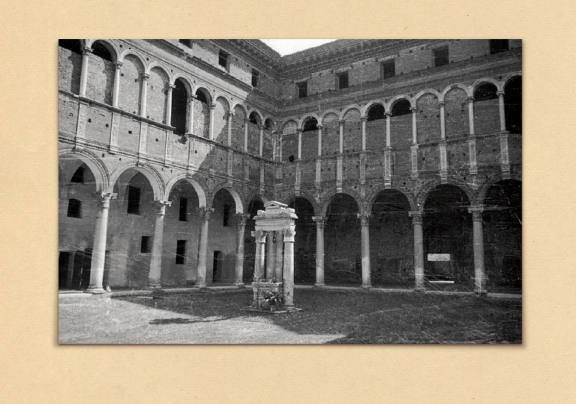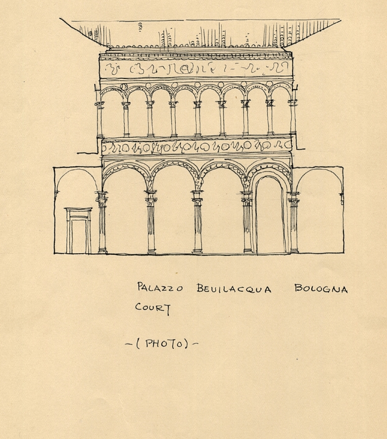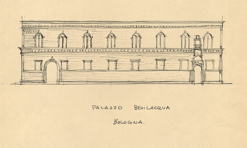 (Palazzo Bevilacqua),博洛尼亚建筑外部采用粗凿的方法,有柱础,顶端有沉重的檐口。这里他们使用了一块劣质的石头,如今许多地方均破裂。庭院非常有趣,一层和二层是佛罗伦萨风格的拱廊。中庭二楼的开间是楼下开间面积的一半,较大的比例差异使第二层看起来非常轻盈。