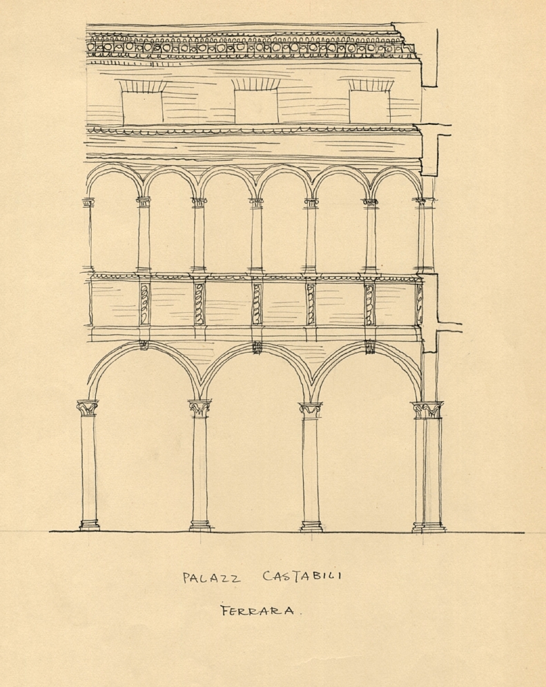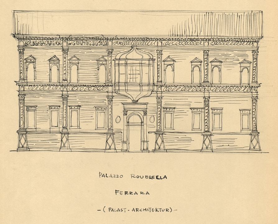 1492年至1493年,比亚焦·罗塞蒂(Biagio Rossetti)参与府邸的设计建造。据推测,转角处的壁柱很可能出自埃尔科莱·格兰迪(Ercole Grandi)之手。檐口部分则于1567年竣工。尽管从窗户的比例看,要比博洛尼亚饮泉宫优化,但立面的设计建造还是沿袭了饮泉宫的建筑风格。建筑上层长方形的窗户显得格外尊贵,这与转角处装饰奢华的壁柱形成鲜明的对比。壁柱因其奢华的装饰,让人们几乎察觉不到它们的承重能力。