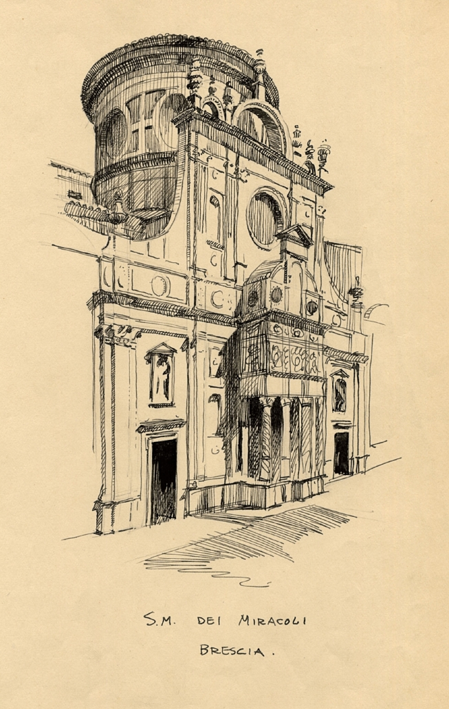 (Santa Maria dei Miracoli),布雷西亚建筑仅有下层的立面,上层为后来建造。非常华丽。建筑许多地方具有非常显著的伦巴第流派的特点,使用烛台来装饰壁柱,比例精确。建筑采用像圣撒迦利亚教堂的半圆形山形墙。