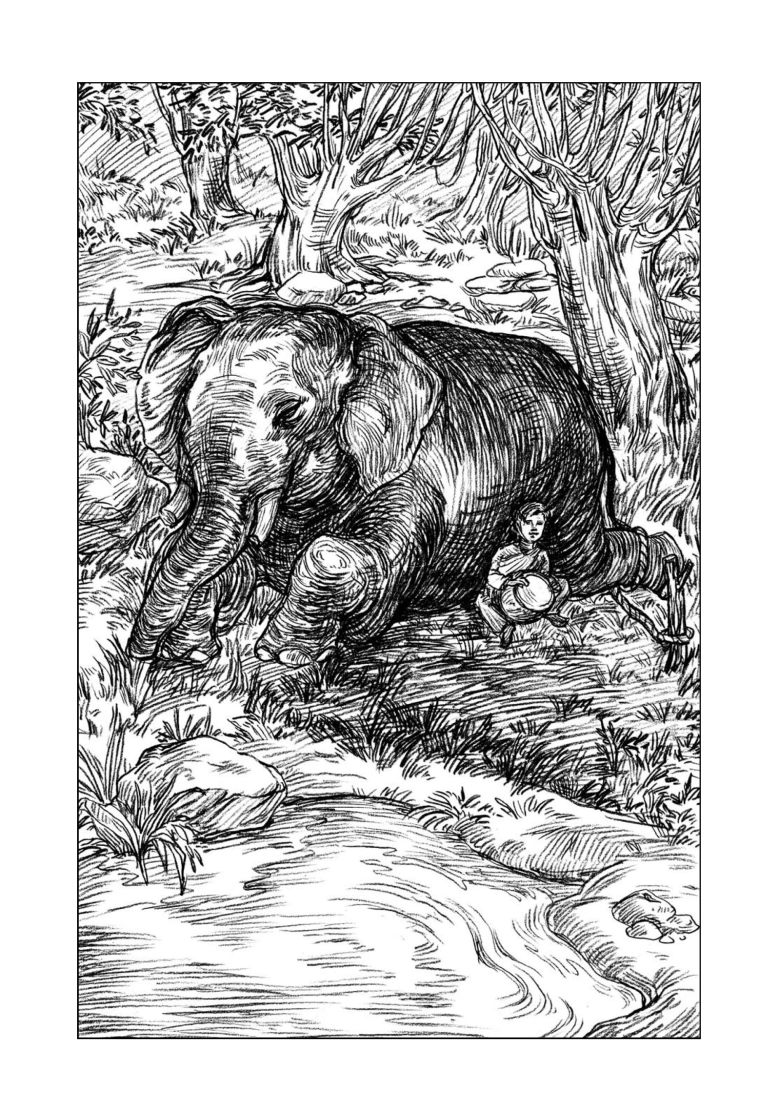 “嘿,你们在说谁?我还不知道从平原来的赶象者有了不起的好家伙呢。”皮特森·莎希布躺在普德米尼背上,回头好奇地问道。谈话者恭敬地回答道:“那是一个男孩。在我们上一次的围赶活动中,他冲进围场,抛出绳子,要帮我们抓住一头小野象。虽然他自己个头还没小野象大呢,不过他真是相当勇敢和能干,帮了我们大忙。”说这话的时候,他指着旁边的小吐迈。