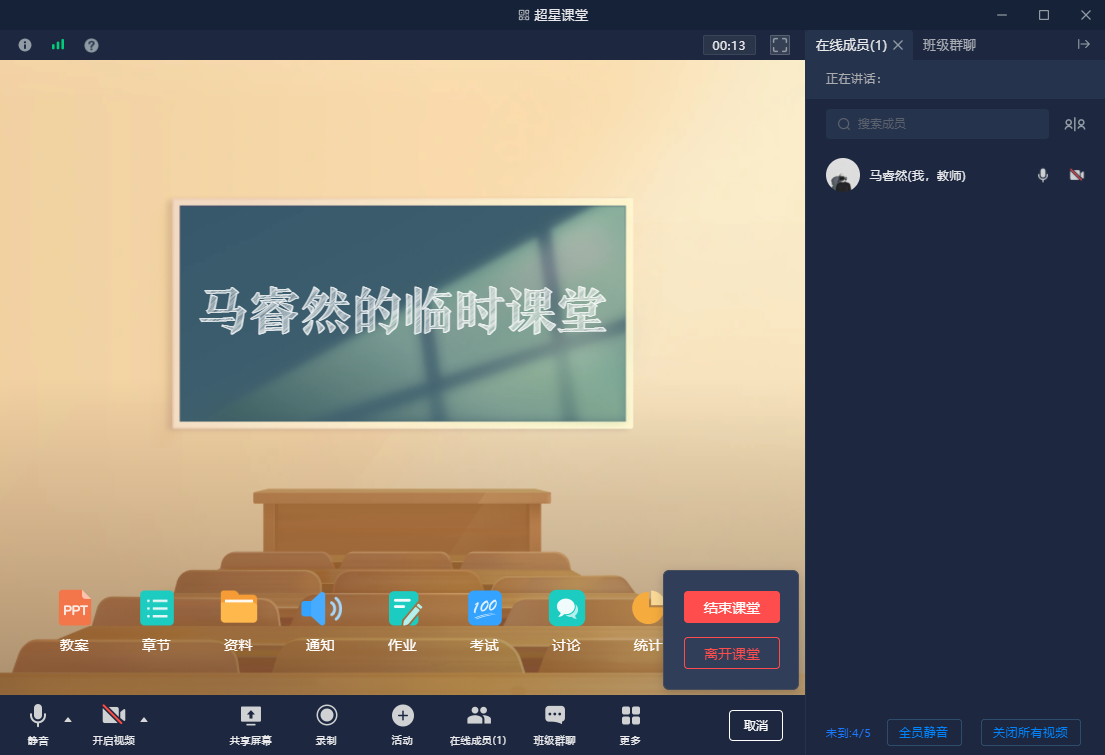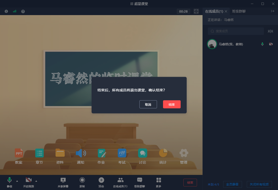 当您的身份为教师:当您身份为教师时,您点击“离开课堂”以后可以选择“离开”或“结束”,离开是指您离开该课堂,不影响其他成员的操作;结束是指结束当前课堂,所有成员都讲离开课堂。系统将在课堂结束后进行统计、录制视频合成转码操作。
