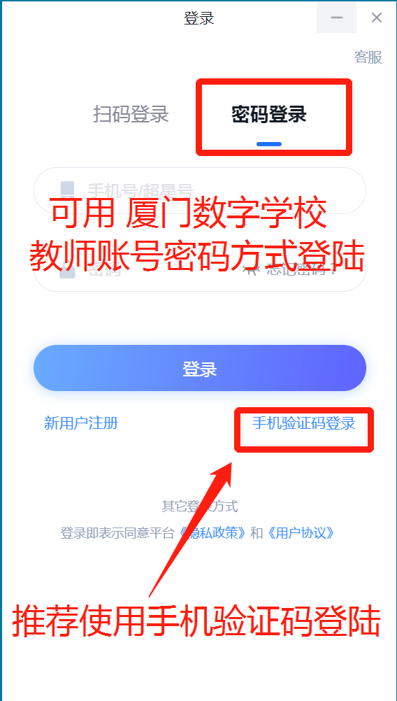 切记【新用户不要自行注册】若您使用手机短信验证方式不能登录,请联系本校厦门数字学校平台管理员添加账号,或者联系超星厦门本地客服人员(小黄15160737569或小林18850444341)添加处理。