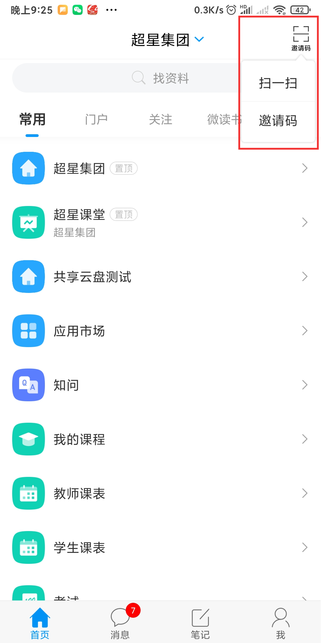 打开学习通,首页右上角,可选择邀请码输入课堂码或扫一扫功能扫描课堂二维码加入课堂