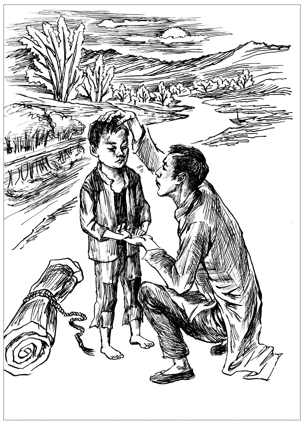 出村不远,忽听背后有人叫他。回头一看,却是小铁头。虽然已经是秋后的天气,还穿着破旧的单褂子,敞露着窄瘦的胸脯,补丁摞补丁的裤子。可怜巴巴地眼望着柴老师。突然扑过去,紧抱住柴老师的腰,那一双直望着柴老师的眼睛里滚出了大颗的泪珠,顺着小脸蛋往下流。呜咽着说: