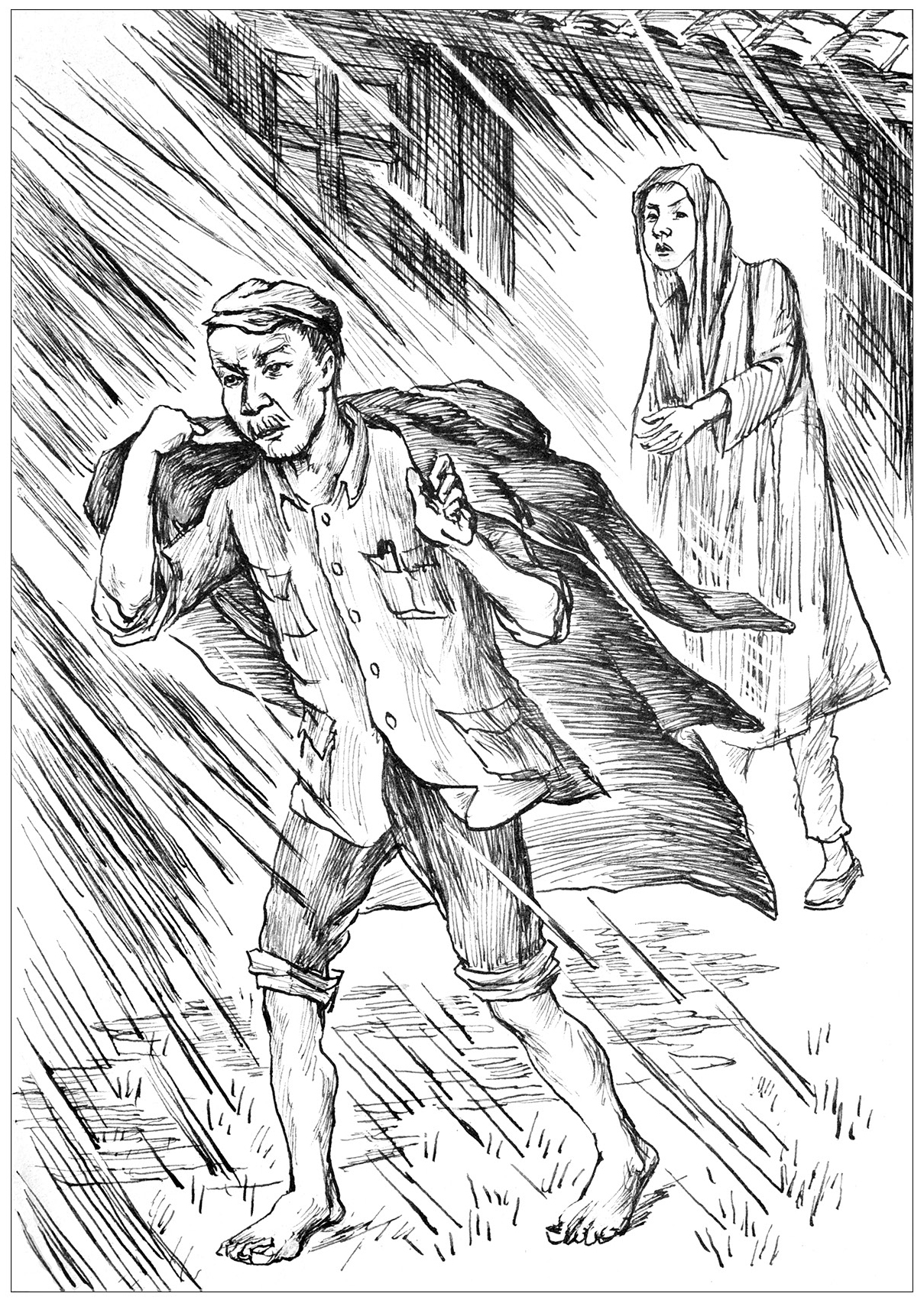 他向桌边走来,两只光脚在砖地上留下清楚的湿印子。他一屁股坐在椅子上,舒了一口气。看来,他已经十分疲累了。他没有脱雨衣,只把雨帽推到后脖颈上。旧得发白的灰布帽子,帽遮檐被雨水打湿了,软塌塌地耷拉着,遮着他略宽的脑门儿。他耸起肩又舒了一口气,眨眨眼,眉毛上的水珠便滚落在桌子上了。他一边伸手在口袋里掏摸着,问我:
