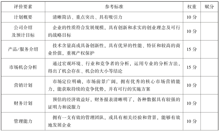 创业计划的评价标准应该根据计划书的读者而定。创业计划编写的目的不同,评价的标准也不同。表7-4 是从创业投资基金或投资者角度设计的参考标准。
